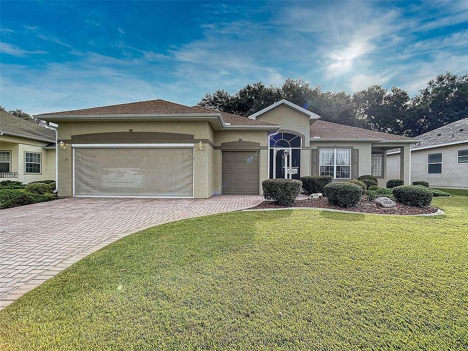 Stonecrest 55+ Gated Golf Course Community with all the amenities and 4 pools, golf course and close to shopping and The Villages by golf cart. This stunning Avondale model by Oriole is centrally located (close to the country club and main entrance). The front on this home faces the 13th tee box and the backyard looks over 80 acres of beautiful rolling green pastures and cows. It is gorgeous! ROOF 2021, A/C 2016. Upon entry of the home you will notice the high 12foot ceilings that graduate to 10 ft through out the rest of the home. The home has 2 bedrooms and a den with French doors that could easily be a 3rd bedroom. The master suite has double door entry with a huge walk in closet and master bathroom with walk in shower, large soaking tub and his and her vanities. The kitchen has pull outs in the cabinets, an island, deep sink and overlooks the family room. Picture windows cover the family room wall allowing you to see the beautiful country setting. The second bedroom is graced with a wonderful 2nd bathroom and large glassed walk in shower. The lanai is enclosed with acrylic sliding windows, a mini split a/c and perfect for another TV room overlooking the country setting. Step outside of the lanai and you are greeted with a large bird cage screen porch perfect for grilling and sitting outside and watching birds and the sunrise. The two car garage has an attached golf cart garage and as electric screen door. This home is one of a kind with a front view and back view of true beauty! Lovely appointments are through out the home with crown molding and tile and laminate flooring and pavers in the driveway, to name just a few. Hurry to see before this one gets away!