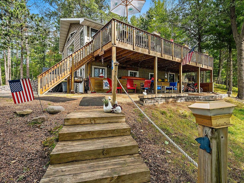 Welcome to the serene waters of Bass Lake. This picturesque retreat offers stunning views via large windows that provide natural light to flood the interior & panoramic views of the lake. The open-plan living area includes a large comfortable seating area arranged around stone fireplace & a large dining space. All bedrooms offer a peaceful retreat. Outside the deck is perfect for enjoying meals, with a large dining table, comfy lounge chairs & a gas firepit. Stairs lead down to a gently sloping yard that meets the water's edge where a private dock extends into the lake, ideal for swimming & fishing, making it an idyllic getaway for family & friends. 171 water frontage on Bass Lake on 1 acre. Includes parcel #04240041173M of additional .17 acres non-water frontage. Offer review 9/9 12pm