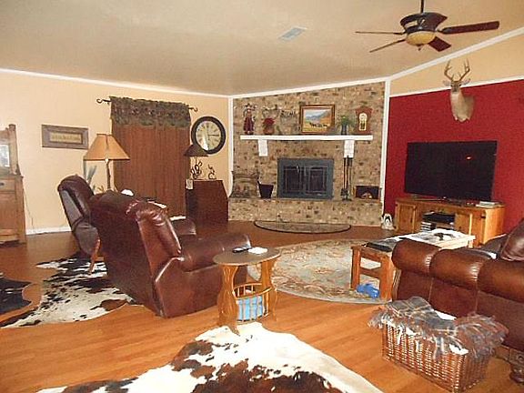 HOME WITH A LOT OF HEART! This 4 BR, 3 bath home with siding sits on 5 ac, more or less, with a quiet country feel. Huge living room with a fireplace & dry bar & room for everyone, game room, dining room, great kitchen with an island, built-in bkfast bar & lots of cabinets, lg. master suite with entrance to a screened in porch with a wood burning stove perfect for your morning coffee, office, cov. deck & outdoor firepit area for entertaining or simply enjoying the quiet country breezes & wildlife. Oversized garage, place for RV with utility hook ups, storage buildings & a 1500 gallon water storage tank with pump. This property is looking for a new family to make new memories!