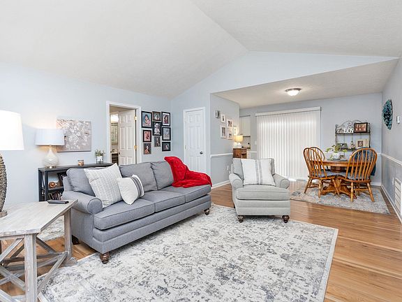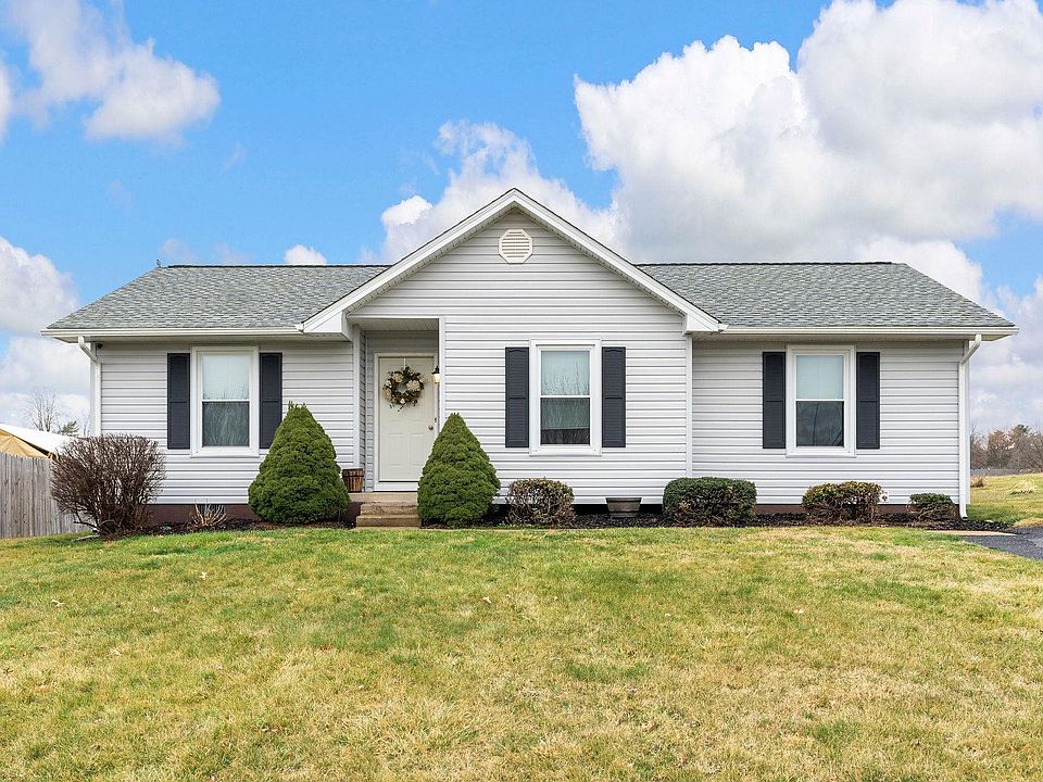This 3 bed 2 full bath ranch has recently received a top to bottom refresh! Hardwood laminate flooring throughout. Great room style floor plan combines the spacious living room and dining area under one vaulted ceiling. Recessed media alcove in living room. Updated cabinets, counter tops, tile backsplash and stainless appliances including stove, refrigerator, dishwasher and slimline microwave. Laundry area off kitchen. Floor plan has the primary bedroom and secondary bedrooms separated by the living area for a little privacy. Primary is quite spacious and features a walk-in closet and full attached bath with updated vanity and lighting. Secondary bedrooms on opposite side of the house are accommodating and feature full size closets and are separated by a second full, updated bath. Recently rebuilt rear deck is found through the sliding glass doors off the dining area. Storage shed in backyard.