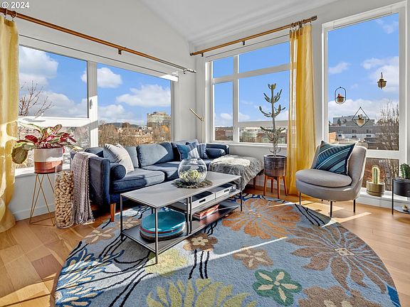 Premium Unit!! TOP floor facing SE with Mt Hood Views, vaulted ceilings and $70,000K in renovations and upgrades just completed. Sunny and bright and perched high above the surrounding trees and buildings, it offers a wonderful vantage of the city, neighborhoods and downtown from the oversized deck and living room. Remodeled Kitchen with Italian Pedini Cabinets (2023)Built in Appliances - Fisher & Paykel (2023) Built-in Stove Hood - Miele (2023) New Sink and Smart Faucet (2023)New Alluvial Quartzite Countertops (2023) New flooring throughout living spaces: (2023)New carpet in bedroom and Engineered hardwoods. New Central HVAC system (2019) New Bathroom Mirror-Hotel Collection (2019) New Smart Home light Switches (2019) New Hunter Douglas Smart Home shades (2019) Only lived in for part of the year: Pristine/like new condition. Fabulous option for Pied-à-terre. Carefully considered for its many perks only available to this unit and floor: Storage unit and trash room located across the hall. Rare corner windows. Preferred parking space location and the unit on the top floor with vaulted ceilings. Pets allowed, Secure entry and parking. Grocery across the street with popular shops, restaurants, and cafes surrounding where you can get almost everything you need. Beautiful walking in Irvington Historic Neighborhood. Easy access to the bus line & downtown. Live the Portland lifestyle in this vibrant NE Portland neighborhood.