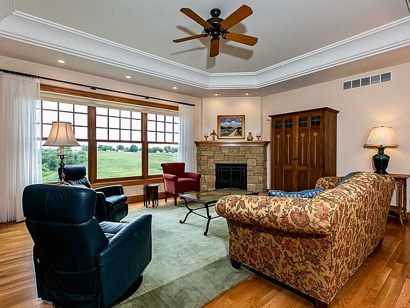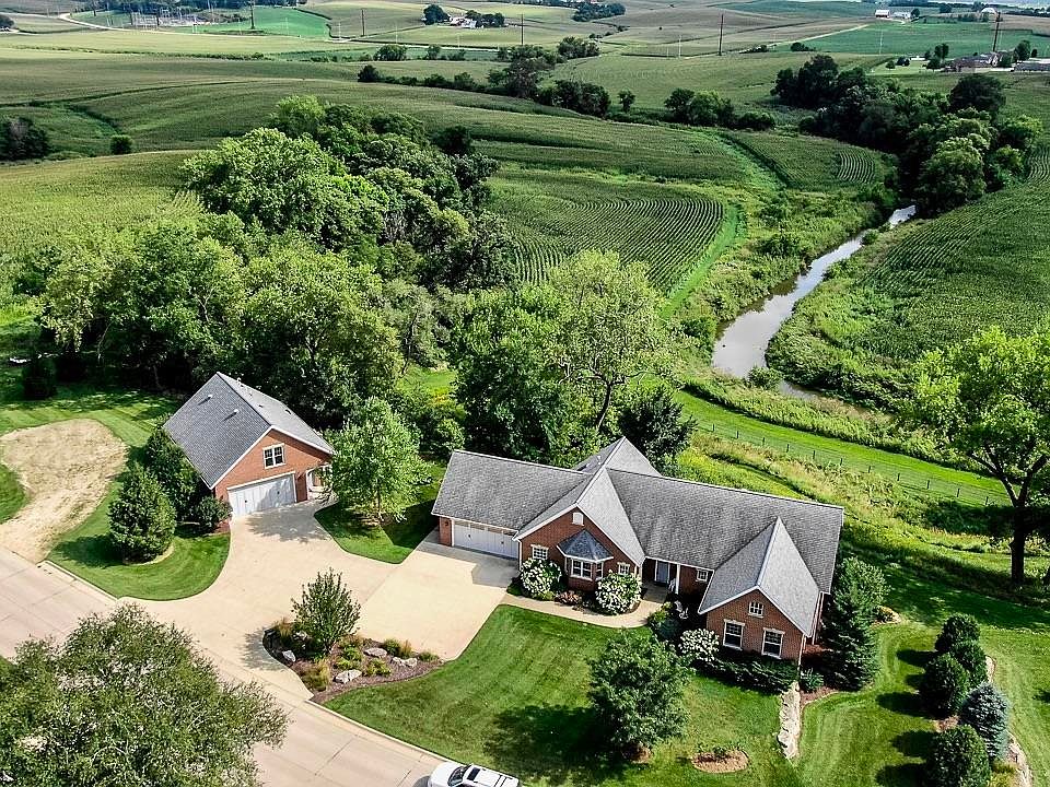 The essence of this magnificent home can only be fully captured by a private in-person viewing. Constructed with top-of-the-line systems and abundant space, the home was designed to maximize the views of its picturesque, rural setting. Upon entering the front door, the living room features a wall of windows providing a panoramic view of your private and serene backyard and the creek below. The separate dining room shares the view with ample space for holiday entertaining. The kitchen with custom oak cabinetry, granite countertops and stainless steel appliances also includes a walk-in pantry. Conveniently located next to the garage is the laundry room. Your three seasons room is the perfect spot for enjoying your morning coffee or evening glass of wine with views of local wildlife and migratory birds. The lower walkout level of this home is just as impressive with the family room and two large bedrooms also providing expansive views. In addition, there is in floor heat two full bathrooms, a kitchenette and plenty of storage space. A second building, the Carriage House provides a great place for guests to stay or a home office / business. Finished with in floor heat, a full bathroom, bedroom, living area, plenty of garage space and roughed in second bathroom. As impressive as the home and carriage house are, the land you are surrounded by is even more alluring! You have 360 degrees of incredible views! Plenty of space to enjoy, relax and entertain. Spend time enjoying walks down through the path that is surrounded by beautiful hillside Iowa Prairie with a variety of native plants and wildlife. This incredible path leads to a gorgeous area that once served as a quarry. Entertain surrounded by all of Iowa's best features bluff rock, Oak trees, corn fields, creek and prairie. This type of property does not come up often. Schedule your private showing now to fully capture the essence of what your new home could be!