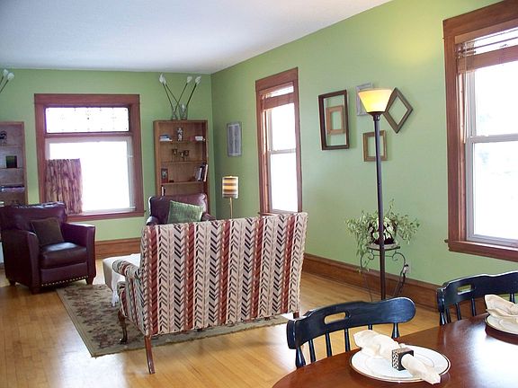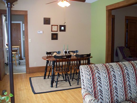 Open, light-filled brownstone unit with 9ft ceilings and hardwood floors. 2 BR, plus den/media room, or add doors for an additional bedroom. Charming stained glass and built-ins. Huge living / dining room area. Granite tile counter tops and updated kitchen with dishwasher. Forced air with central AC for MN extremes. South-facing for lots of sunlight in all seasons and quiet privacy away from 18th St. Lovely porch for 3-season meals in the open air. On a dead-end street so there is very little traffic going by. Low heat and electricity bills (avg. of just $100 per month for both). Private off-street parking space. Lovely garden boxes for fresh tomatoes, peppers, potatoes, beans--you name it! Washer and dryer in basement (just $2.00 to both wash and dry). Large storage space and workshop area in basement. Ample closets/storage. Close to shops (Target, Rainbow foods, Home Depot, Post Office, and more just 5 blocks away at the Quarry) and to a variety of ethnic grocery stores and dining on Central Ave. Easy public transportation (from property to downtown in 20 minutes). Just a mile from the great bar scene on University Ave. in Nordeast. Just 5 blocks to both US Bank and Wells Fargo. Just 4 blocks to the terrific, newly remodeled Northeast Public Library. Great, safe location near schools and there is a bike lane right outside the door that takes you to the dozens of miles of bike paths throughout the Twin Cities. A real gem!