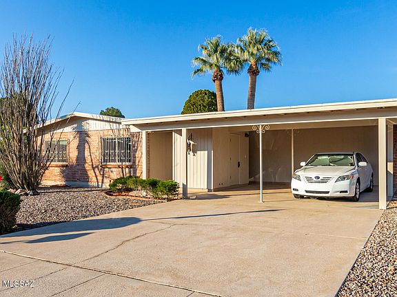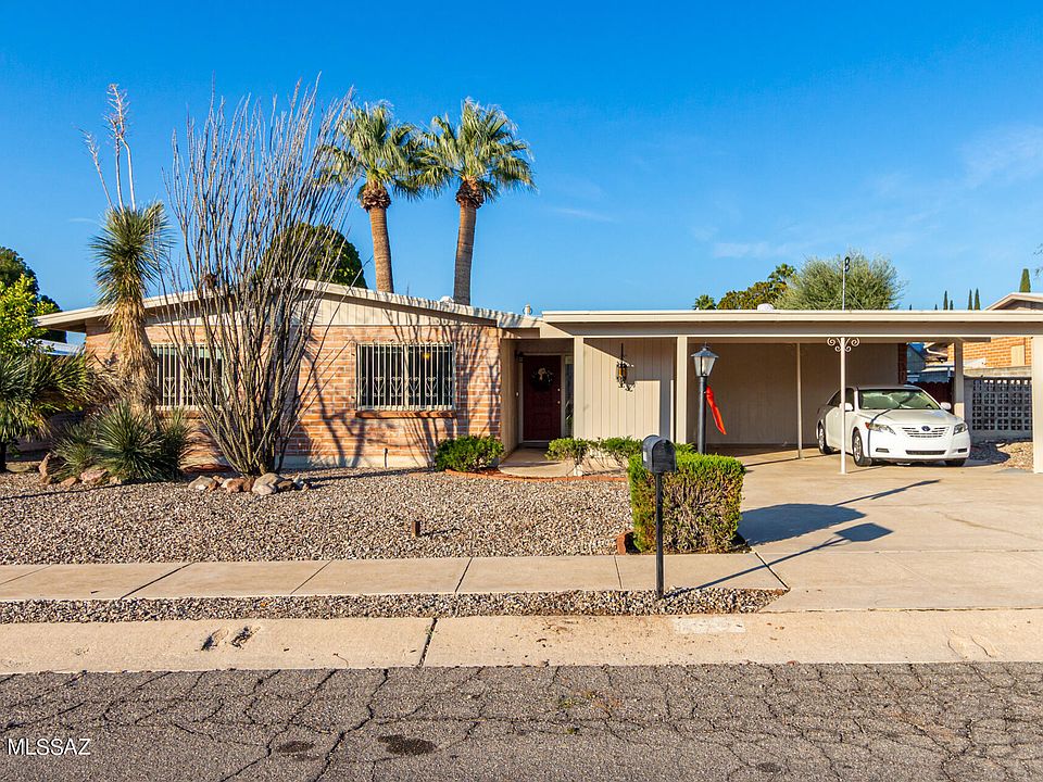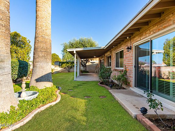 Fantastic opportunity in the charming golf course community in Rolling Hills ! This ONE owner home has been well cared for inside and out. Enter this welcoming home offering an ideal floorplan and two living spaces, and a cozy bee-hive fireplace in the family room, You will love the LARGE bedrooms; the primary bedroom features ample closet space & a private bathroom with dual vanities. Backyard features lush landscaping including mature fruit trees, & 11 beautiful rose bushes. Relax under the expansive private covered patio overlooking Tucson sunsets. Additional features include low care siding, extra outside storage, dual pane windows, Plantation shutters, and an large carport with side yard space.Don't miss out on this on home!