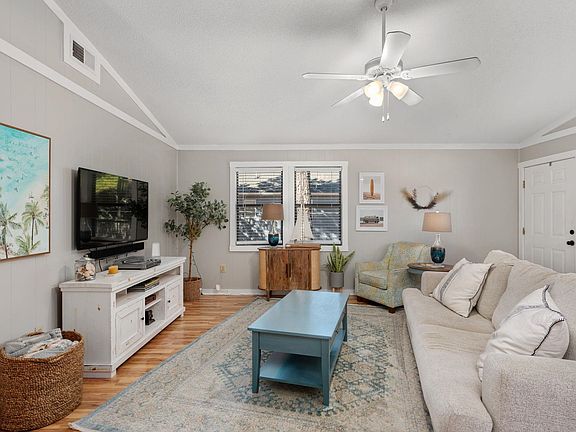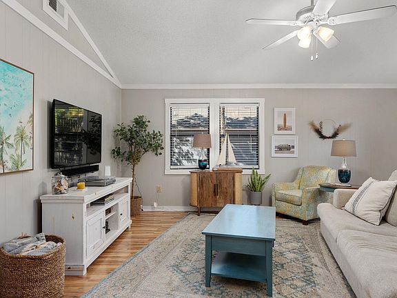 The property, set on an X flood zone lot buffered by mature trees, offers over 955 square feet of comfortable living space on the main level. The open floor plan with a vaulted ceiling includes a spacious family room, dining area, and an open kitchen featuring stainless steel appliances, all surrounded by ship lap walls painted in neutral gray with white trim. The bright, airy main living area is complemented by wood-tone laminate flooring. A sun porch off the family room provides a perfect spot for relaxing, entertaining, or dining al fresco. The space for a full-size washer and dryer is conveniently tucked behind bi-fold doors off the kitchen. Down the hall, the primary bedroom includes a private bathroom and linen closet, along with a second bedroom and a full hall bath.