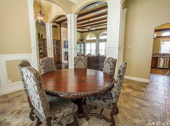 Exquisite Home, Great Room with hardwood floors, formal dining plus breakfast area, Gourmet kitchen, gas cooktop, beautiful granite & backsplash, rolled ceilings in the dining & kitchen, Grand master bedroom suite with lush bath, shower & spacious closet, upstairs offers game room or bedroom suite w/full bath plus storage, stunning ceiling treatments, recessed lighting, wood shutters gorgeous granite throughout, surround sound, professional landscaping w/irrigation, Outdoor kitchen & Fireplace