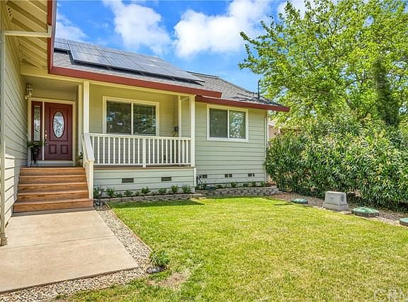 Tucked in the trees and surrounded by lush, mature landscaping, this 3 bed /2 bath home has 1,389 SF built in 2003. Upon arrival, notice the extra wide driveway to cover all of your parking needs! Lovely lawn hidden behindmature oleanders, lends to the home's private feel. Lounge on the covered front porch or entertain off the partially coveredback deck with views of expansive lawn, trees and a children's playset & playhouse. The fully fenced yard is an added bonus! Enter the home to find a tiled entryway which leads to the open living room featuring a propane fireplace as the focal point, recessed lighting & stylishlaminate flooring throughout. The kitchen is open to the living room with propane range, microwave hood, dishwasher & refrigerator included! There is even room to add a wine refrigerator! Breakfast nook or bar, offers dining options toaccommodateyour lifestyle. 3 comfortable bedrooms with ceiling fans. Primaryincludes an oversized walk-in closet and updated dual sink vanity. The 2 car garage with workbench and built-in shelving. This home includes OWNED SOLAR providing the ultimate in ENERGY EFFICIENCY to keep utility costs low year round! Ideally located around the corner from HOA amenities such as Raven Hill park and a short distance from the Conestoga hiking/biking trail. Stay cool this summer at the lake or community pool about a mile away. Hidden Valley Lake has so much to offer and this home is the icing on the cake!
