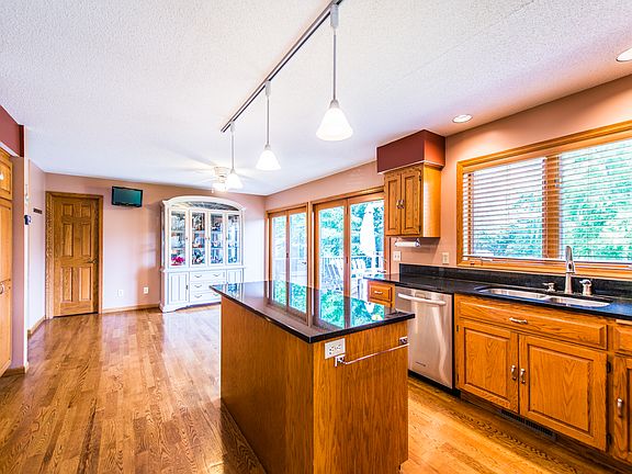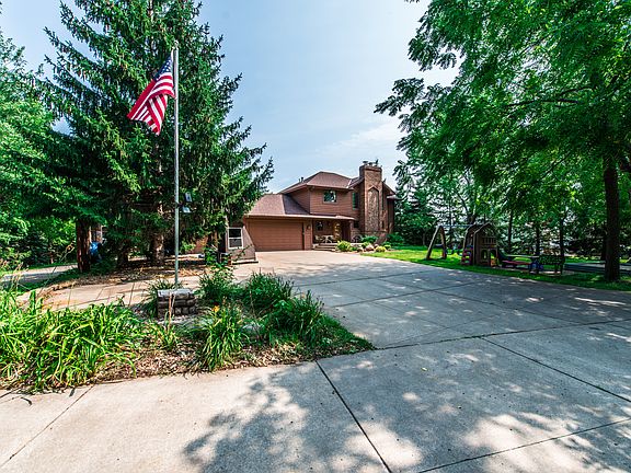 Rare opportunity to own this amazing 2-story home located on a private and sprawling 1 acre lot ~ the feel of country in the city! 30x45 pole barn with 10ft door, heated and finished 3 car garage with three 220 outlets, concrete driveway with extensive parking pad, quality fencing, main level TREX deck with upgraded rails, many new windows, new roof and more! Stunning kitchen with double wall ovens, large center island, command desk station, granite and stainless steel appliances. Solid hardwood floors. Great room with dramatic 2 story brick fireplace. Loft area office space. Finished walk-out lower level. The home you waited for!