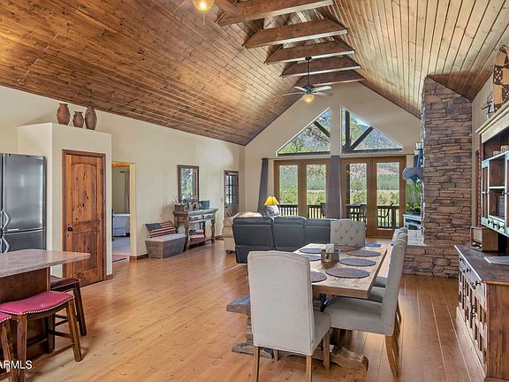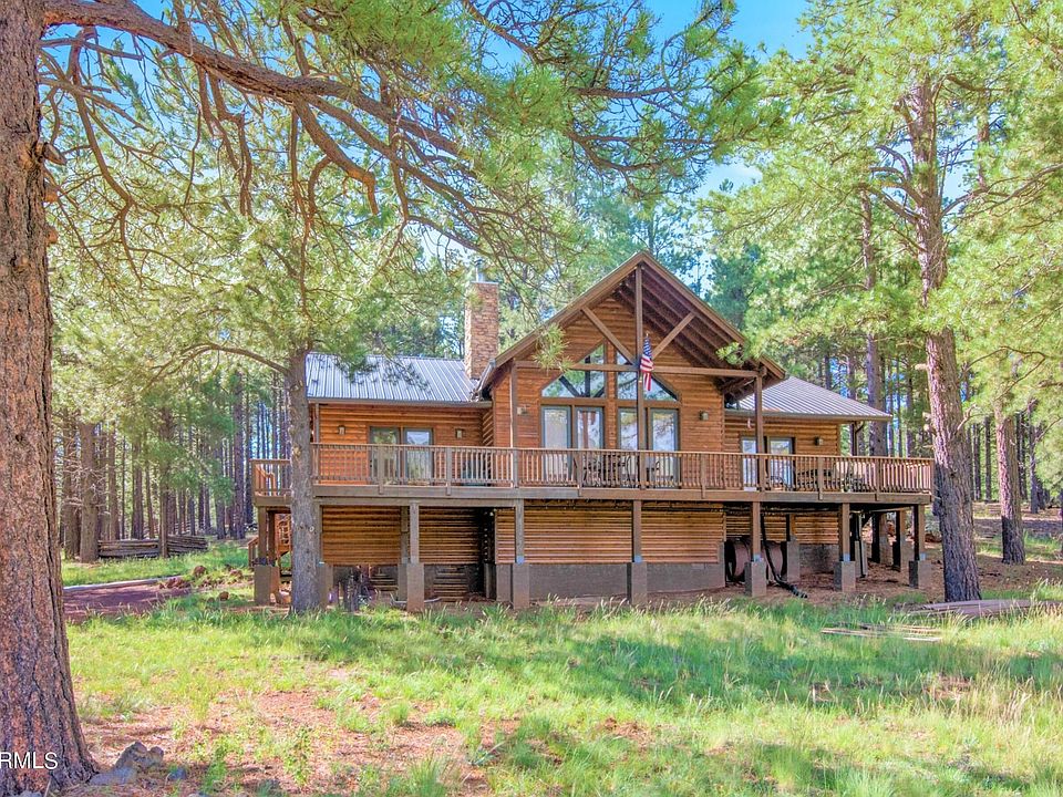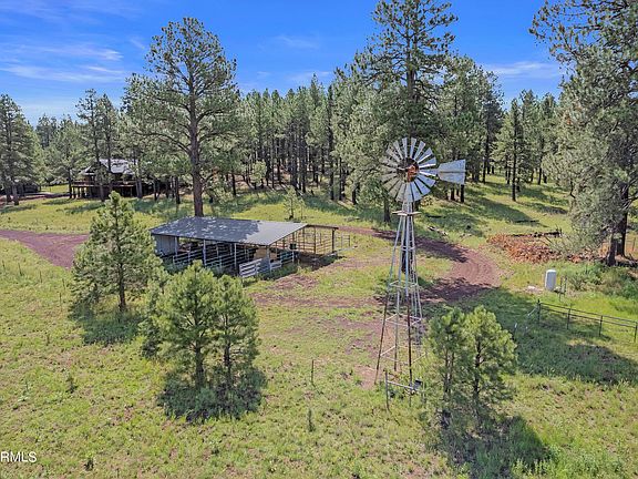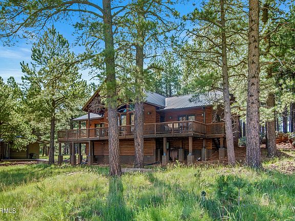 Escape the Heat to Your Fully Furnished Ultra-Private Cabin in the Woods! This Secluded, Off-the-Grid Log-Sided Home is situated on 10-Acres between the San Francisco Peaks to the East and Kendrick Mountain/Wilderness Area to the Northwest. Enjoy Direct Access to Coconino National Forest! The Cabin offers 1976 SqFt of Living Space with 3 Bedrooms, 2 Bathrooms, and an Open Great Room Layout, Perfect for Hosting Family and Friends. The Great Room Features Vaulted Wood Ceilings and an Impressive Fireplace with Floor-to-Ceiling Stone Surround and Hearth. Double Sets of French Doors Lead out from the Great Room to a Fabulous Deck providing Stunning Views of the Ponderosa and Aspen trees and Kendrick Mountain. The Open Kitchen has Cherry-Stained Knotty Alder Cabinetry, Stainless Appliances, Gas Range, and Large Island with Breakfast Bar. The Kitchen, Primary Bedroom, and One Secondary Bedroom also have Access to the Deck. The Primary Bedroom has a Walk-in Closet and En-Suite Bath with Tub/Shower Combo & Double Sink Vanity. The Property also includes a 4-Car Detached 30x40 Garage with Extensive Patio and 3-Roll Up Overhead Garage Doors, 8-stall 1/2-covered Horse Facilities with Storage and Nearby Water Tank with Pump; Solar Panels and Battery Shed, 5000-Gallon Hauled Water Tank, and Much More! Tons of Potential for the Horse Lover or Someone Looking to Get Away from it all!