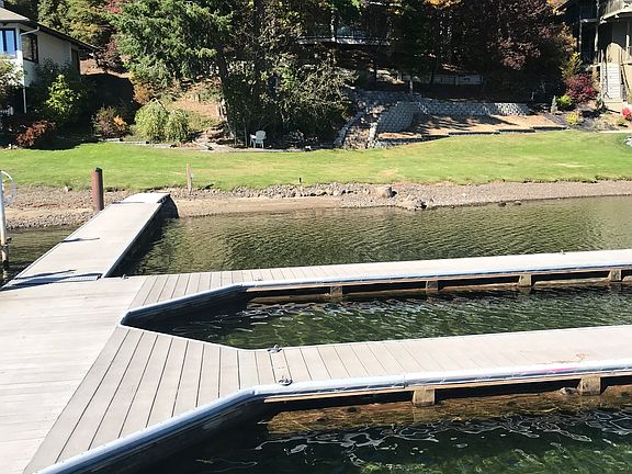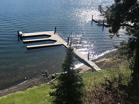 CDA LAKE WATERFRONT-PRIVATE BEACH/DOCK year round paved access to the front door! Wide open views from all levels. A peaceful, quiet getaway with lovely grassy, level beachfront. Close to Rockford Bay Blackrock Marina, only 20 minutes to CDA and 45 minutes to Spokane's South Hill. Located in Blackrock Beach Estates gated community, just below the Blackrock Golf Course on approx 100 feet of waterfront. Features 2 slip (Trex Deck/type) dock with 2 jet ski lifts and (Trex Deck-type) decks on three levels. 1/King main bedroom, 3/Queen bedrooms, 1 sofa bed in loft, multiple bedding/bunk bed choices in lowest level for families with children.Newly remodeled with new furniture arriving SOON! NEWLY REMODELED IN 2024/25 Available now! $9,500/month for 1YR Lease OR ONE MONTH MINIMUM at seasonal rates:(Peak rates $30,000/mo for JULY or AUG, $25,000/mo for SEPT or OCT, winter months negotiable or Inquire for a specific month. Must agree to HOA CC&Rs FULLY FURNISHED, MOVE IN READY- owner will provide linens, appliances and lawn maintenance. More photos on request.