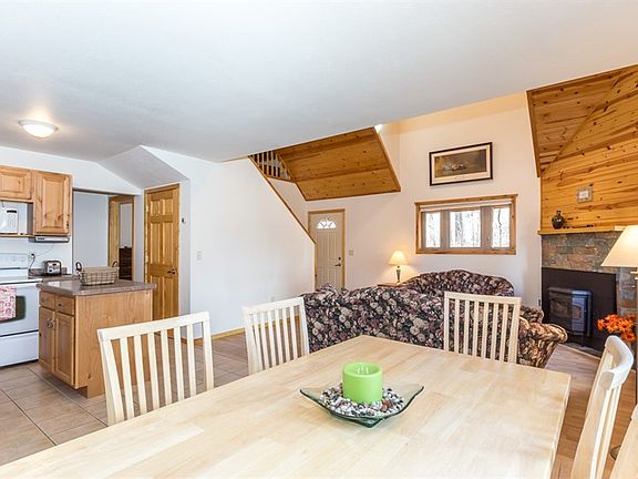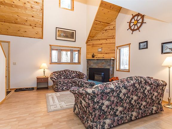 A very sweet, log sided contemporary home nestled under towering white pines! Enjoy rocking on the front porch under the canopy of trees. Built in 2005, this home is totally move in ready. The main floor is open-concept with 20-ft vaulted pine ceilings built on a heated slab. The living room is centered around a pellet wood stove set in slate. The kitchen has high quality, Medallion knotty alder cabinets with dovetailed drawers and a center island. The dining room and kitchen have tiled flooring and are open to the living room. There is a main floor bedroom, bath room and laundry room. The second floor has a loft overlooking the living room, 2 bedrooms and a second bath with slate flooring. There is plenty of storage for your toys in the huge 35x54 6-car pole barn. DonPt miss this nature lovers dream set on 2.98 acres that boast hiking trails and a pond! Electric: $93.00