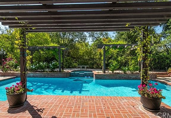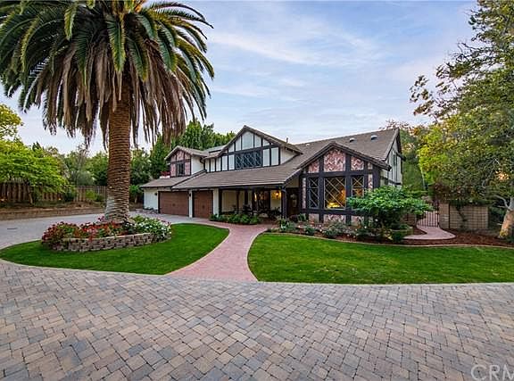 This is an astonishing secluded hide away! A Tudor style, hidden jewel, designed with period details and modern conveniences boasting 4 expansive bedrooms, 5 bathrooms, and over 4600 square feet of amazement. Designed for appeal inside and out. Nestled in privacy on park like grounds with abundant trees and an amazing pool and spa. Notice the fabulous carved wood entry as soft light sweeps in from the large picturesque Andersen windows. Observe the intricate interior layout with vaulted ceilings, arched walls, and gorgeous custom built-in cabinetry throughout. Warm, natural colored, slate tile floors, massive crown moldings, stunning wood floors, and lovely staircase. The spacious masterpiece kitchen offers custom cabinetry, recessed lighting, granite counters, a large island, two dishwashers, new double oven, five burner cooktop, and a walk-in pantry! An elegant dining room with conversation fireplace or the formal dining room for other occasions. An inviting retreat awaits beyond the double stained glass doors. Relax and enjoy the built in entertainment cabinetry and let the games begin. The main level includes a music room/library and sought after private guest bedroom with full bath and private patio entrance. The spacious upstairs bedrooms are en-suite with walk-in closets and connecting balcony. The AMAZING master has vaulted ceilings, a cozy fireplace sitting area, light and bright bathroom, stand-alone soaking tub, massive custom shower with multiple shower heads, his & hers vanities, and a walk in closet. The incredible office is convenient and private just off the master suite with built in desks, file drawers, and cabinets. This entire level looks out to the relaxing colors of the impressively lush back yard with a refreshing and sparkling pool and spa, and peek-a-boo mountain views. Now for the piece de resistance and a cherry on top! Lush landscaping, mature shady trees, brick walkways, and two outdoor sweeping brick patios with a matching brick gas lit fireplace. All the magical lighting by night makes your entertaining under the stars truly special. Includes three zoned air conditioners, 2 laundry facilities, 3 car 800 sq. ft. garage, over .60 acres w/variety of citrus trees, a finished attic with pull down stairs, whole house fan, and concrete tile roof. The "cherry on top" is the paid for solar system! This is a truly a special home, loved and cared for, that you will now share your own joys and memories with all your family & friends.