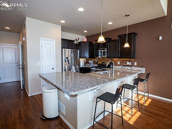 This beautiful 4 bedroom 4 bath home in Broadmoor View is open, bright and ready for you to start your Colorado Living. Wonderful granite countertops in the kitchen, hardwood floors throughout the main level. Stainless steel range oven and dishwasher, The second floor features a lovely balcony to enjoy mountain views, with vaulted ceilings and washer/dryer area near the bedrooms. the master bedroom has a large walk in closet and beautiful 5 piece master bath. The basement has a family room with a wet bar and in ceiling surround sound speakers built in plus one additional bedroom. There are neighbors on one side of the home and on the other is a lovely park just off your awesome stamped concrete patio with a built seating which adds privacy and functionality,