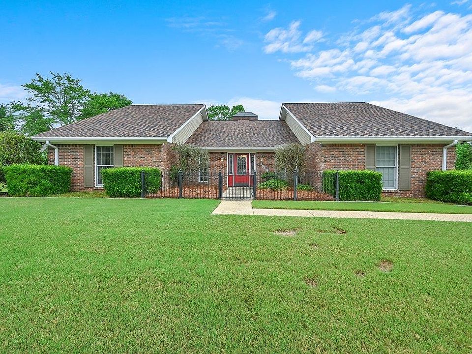 Well maintained 4 bedroom 2.5 bath brick home in secluded subdivision. Courtyard entry leads you into large open Living room with brick gas log fireplace and open window bar area. Formal Dining room for family gatherings flows into beautiful kitchen with lots of Oak cabinets, solid surface countertops kitchen island as well as sitting bar area & bay window breakfast nook. Sun room with wall of windows, plantation shutters that leads out to patio and custom privacy fenced backyard makes the perfect spot to wind down. 3bedrooms on main level including master en suite with updated handicapped accessible walk in tile shower, separated double vanity with granite tops and 2 closest. Upstairs has 1 bedroom or perfect office/ game room. Great sized laundry room and side entry 2 car garage. Storage building in back, professionally landscaped and sodded yard. Newer roof.