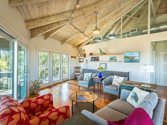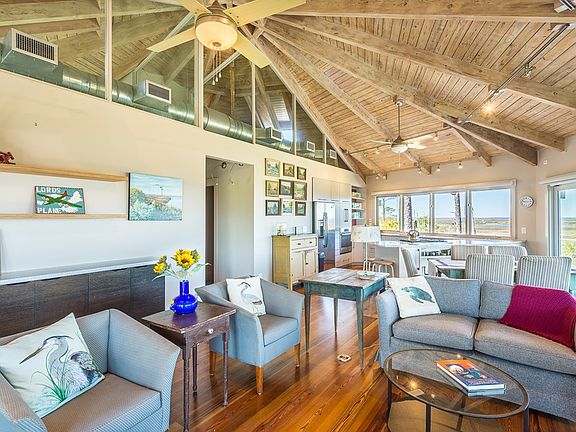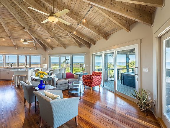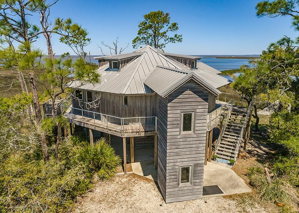Bayfront, cypress octagon home in St. George Plantation located on a point with stunning panoramic views from every room! Completely renovated in 2014 with new doors/windows/roof/elevator and a boat dock and lift right on your side canal, you are living less than 100' from your boat! Glowing pine floors throughout the great room and kitchen and beamed, vaulted tongue and groove pine ceiling but the highlight is the view from the wall of windows and sliding doors with bay views from every angle. The modern chef's kitchen with granite countertop, custom cabinetry, gas stove, is surrounded by a wall of windows, you won't miss a sunset or an eagle fly-by while cooking your fresh catch! Large sliding doors on all sides of the house open to the wrap around deck and peaceful screened porch, enjoy the breezes right off the bay. This jewel box, 2BR/2BA has a spacious primary suite features vaulted, beamed ceiling and elegant en suite bath with walk in shower. Guest room is situated to enjoy bay views as soon as you wake up! Ground level storage room and outdoor shower, plenty of space for storing fishing/kayaking/beach gear. Enjoy the privacy, while still only mile to community pool and club house and even less to the beach!