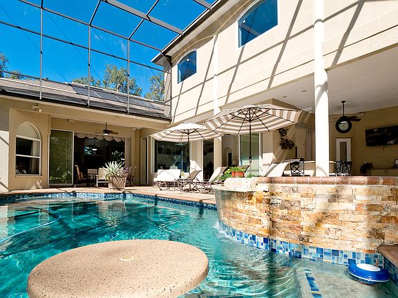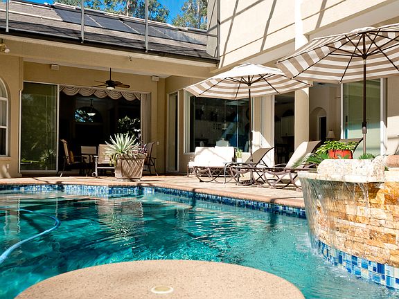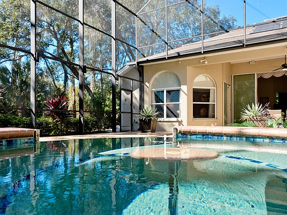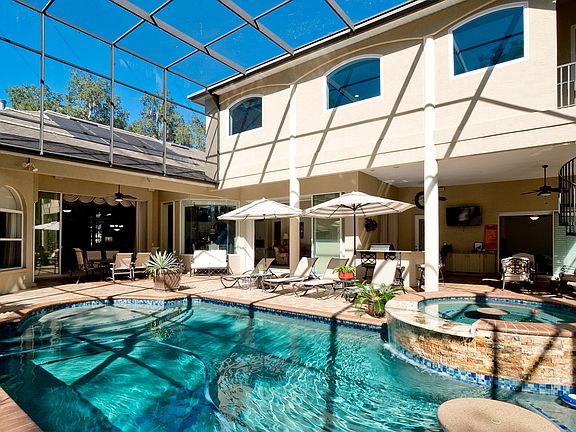 If you are looking for the perfect blend of country living and yet close to the city, this is your home! A beautiful, custom built gated estate, on 1.82 acres, that has been lovingly maintained and updated as well. Surrounded by majestic 100 year old oak trees ~ the perfect family compound or a place for you to relax in the total peace and quiet…. Once you enter the home, you have a beautiful view of the magnificent pool, spa and patio area, which is in an enclosed lanai. New (2017 rehab) Pebble Tec Pool and Spa has Aqualink controls, LED color lighting, solar and gas heating for swimming year round. There is also a huge outdoor kitchen area with a gas grill, refrigerator, bar and covered seating/dining area that is wonderful for entertaining. The private owners suite with wood floors, his/her closets and double stepped ceilings is so inviting and the master bath has gorgeous upgraded granite counters complete with vessel sinks, walk through shower, double shower heads, separate soaking tub and all Hans Grohe fixtures. The Kitchen and Great Room features spectacular views thru 10-foot sliders centering around the indoor & outdoor entertainment area and there is a beautiful office with built-ins for those who work from home. Upstairs, The Ultimate Entertainment Space with a fully built-in bar for stay at home movie night; gaming; cards and other family fun! This home also features Multi-line telephone system, 9 camera security system hard wired with IP address and 16 speaker entertainment system. The exterior has just been repainted, custom plantation shutters & drapes installed throughout and a new French door Kitchen Aid Refrigerator & KA Gas Cooktop.