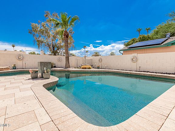 Amazing single-level home with great curb appeal and NO HOA features 3 bedrooms, 1.75 bath, plus a sparkling blue pool, added storage unit, and is now available in the welcoming subdivision of College Park. Appreciate the well maintained front desert landscape and upgraded paver driveway. Inside you will find an inviting formal living room and dining area conveniently located to the eat-in kitchen making it perfect to entertain family and friends. Enjoy the SS appliances, recessed lighting, a lovely breakfast bar, and a pass-through window into the wonderful family room. From here you have great access to the backyard pool oasis where you can relax in the refreshing pool, dine alfresco under the extended covered patio, and stay organized with the added storage. Back inside, wander over to the primary bedroom that offers an ensuite bathroom and a large walk-in closet, along with private access to the back patio. The two secondary bedrooms, guest bath, and laundry space round out this incredible floor plan, so be sure to take a look and start imagining the possibilities. This home is located within walking distance to Pomeroy Elementary school and Shawnee Park, nearby popular restaurants, and great access to SR-101 and US-60 for easy commuting, making this a fabulous place to call home. Make an offer today before this one slips away!