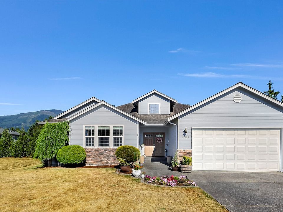 Tucked away on a quiet dead-end street in Nookachamp Hills, this 3-bed rambler sits on a .34-acre lot w/mtn views. Soaring ceilings greet you leading into a spacious layout w/new interior paint & AC for warm months. Spacious recently updated kitchen boasts quartz counters, center island, and a breakfast nook. The open living & dining area features a double-sided gas fireplace & flows seamlessly to a covered patio—ideal for relaxing while enjoying the expansive, level yard. The primary suite features a gas fp, walk-in closet, & ensuite w/dual sinks & soaking tub. 2 additional bedrooms share a Jack & Jill bath. Trails, Otter Pond swimming area, & Big Lake adventures are just moments away, while the conveniences of Mt Vernon are a short drive.