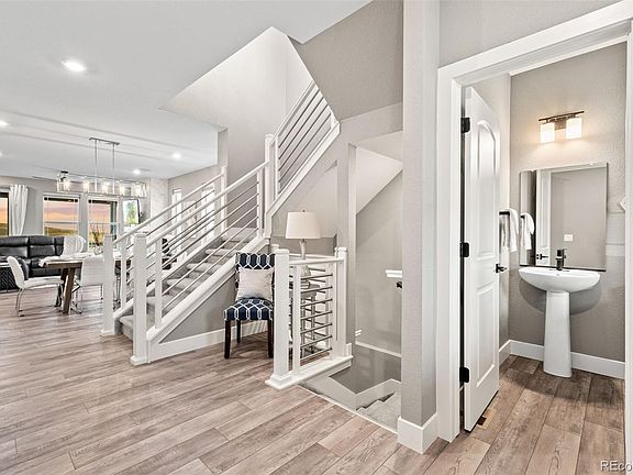 Every detail has been considered: built-in surround sound on main and lower levels, upgraded metal banisters, exterior Trimlights, dedicated EV charging, Cat6 wiring throughout, and a motorized storage lift in the garage. Enjoy SNOW REMOVAL and front yard maintenance by the HOA. Community has 2 Clubhouses/Fitness Centers, Pool, Parks, Trails, Tennis Court and onsite K8 school.