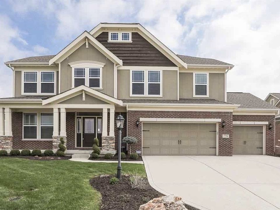 Gorgeous 6 year old 5 bedroom 4 1/2 bath home in Noblesville Schools features spectacular great room with large kitchen island, corner gas fireplace, vaulted ceilings, and a view of gorgeous pond. You will also love hand scraped wood flooring, large office with glass french doors and formal dining room. Chose from one of two main bedroom ensuites with one located on first floor and one on second. Laundry room on second floor. Large walk out basement features bedroom, large family room with full wet bar, full bath, plus 24X14 theatre room. Additional features include security system, water purification system, custom walk in closets, irrigation system, 3 car garage. Home sits on pond.