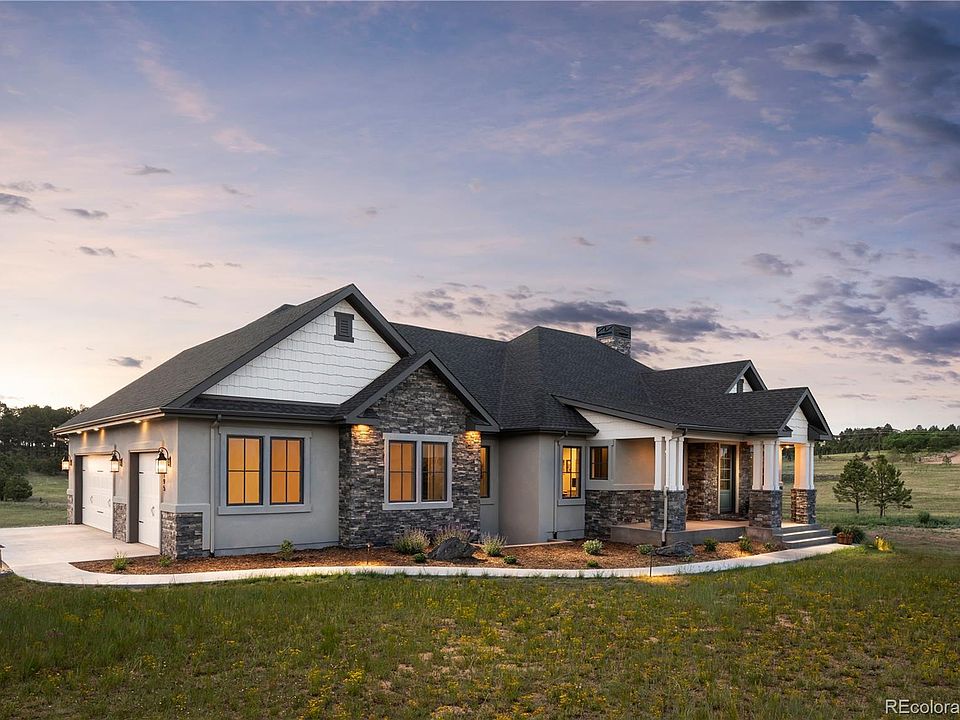 Immaculate custom-built ranch home in Jackson Ranch! Sits on 2.5 acres. Views of surrounding mountains and Pikes Peak! Beautiful scenery during the day, star-light skies at night - all with the convenience of easy access to I-25 and Hwy 83 for easy commuting to Denver or Colorado Springs! 3-car over-sized garage with storage. With 5000 sqft of grass and an automated sprinkler system, there's no reason this home shouldn't be yours! ~~ Main Level: ~ You are welcomed to the home with a gorgeous vaulted ceiling entry made from reclaimed wood ~ Office with Pikes Peak views ~ Master Retreat with luxurious 5-piece bath, walk-in closet with stackable washer/dryer, and access to deck ~ Gourmet kitchen with upgraded appliances and large island ~ Eating area with views ~ Concrete deck ~ Great room with large gas fireplace perfect for gathering ~ "Everything room" perfect for a work space or crafting. Lower Level: ~ Large family room perfect for entertaining or playing ~ 4 large bedrooms, each with a walk-in closet ~ 2 full bathrooms ~ Large laundry room ~ Exercise room ~ 170+ sqft of cold storage ~ Walk-out to covered patio and backyard Upgrades: ~ See "other" document for full list ~ Custom Knotty Alder cabinetry ~ 8" Oak engineered hardwood floors on main ~ Each level has a dedicated furnace and hot water heater ~ Over-sized Allen Block windows wells for tons of natural light in basement bedrooms ~ Custom light fixtures throughout ~ Comcast High Speed Internet with over 200 mbs speed, perfect for working from home - not available in many places throughout the area. *BE SURE TO CHECK OUT BOTH VIRTUAL TOURS (3D AND STILL-PHOTO)!*