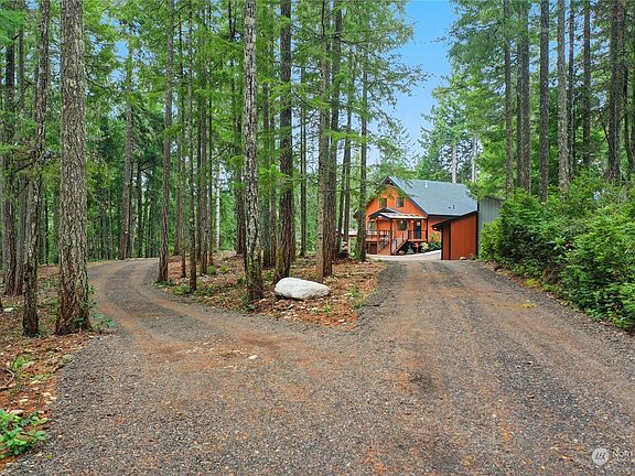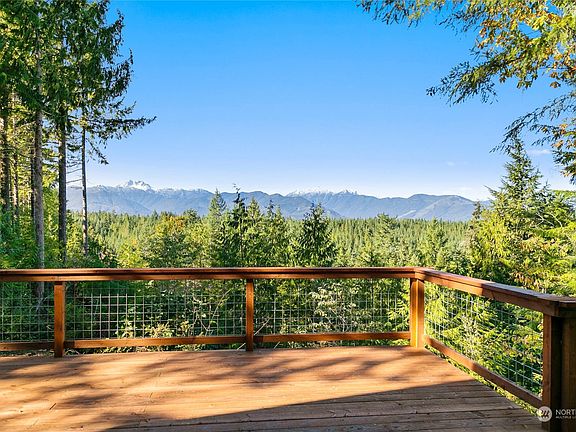 Welcome home to this unique, thoughtfully designed home, sitting on 5 secluded acres with spectacular Olympic Mountain views. At the top of a ridge and bordered on two sides by forested DNR land, the house seems to float above the trees. A sweeping circular drive leads up to the home and huge detached heated 5-bay garage/shop. The home was recently (2023) almost totally updated including new roof, new furnace and heat pump, new interior and exterior paint, new flooring, new kitchen, and Primary bath, 2 decks. Detached garage was re-roofed and painted. The 1656 square foot heated partially finished basement level used by owner as garage. Only a few miles from Seabeck Marina, Hood Canal, and walking trails, this is the perfect rural retreat.