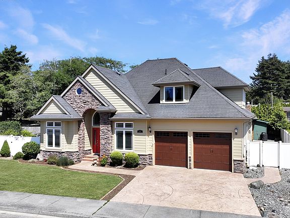 SEASIDE coastal home with deeded beach access, offering an exquisite living experience in every detail. This 4-bedroom, 2.5-bathroom residence features a beautiful den/office on the main level, which includes a closet and can efficiently serve as a 5th bedroom. The spacious formal dining room boasts elegant coffered ceilings, perfect for entertaining guests and family. Ocean views from the upper level. The gourmet kitchen is a chef's dream, with granite countertops, custom cabinetry, stainless steel appliances, a kitchen nook, an eating bar, and a built-in pantry. The primary ensuite on the main level is a true retreat with its spacious layout, exterior entry to a gorgeous covered deck, double sinks, a walk-in shower, an oversized closet, and a luxurious jetted tub.The living room features vaulted soaring ceilings and a sliding door that opens to a huge covered deck, perfect for enjoying the serene courtyard with its enchanting water feature. There is also an exterior detached unique courtyard gathering room with a stone fireplace, ideal for cozy evenings. Please look at the photos; this is a unique and rare feature. Upstairs, you'll find a bonus room, three spacious bedrooms, ample storage areas, and a full bathroom with double sinks and a tub and shower combo. The home also includes an exterior sauna, providing a spa-like experience right at home. The expansive outdoor space offers plenty of room for relaxation and recreation, with the side yard having the potential to be converted into RV parking. The garage is finished oversized with a workshop area and storage. New Heat pumps were installed in July 2024. This remarkable property invites you to explore its beauty through a 3D tour, showcasing every detail of this lovely home. This is your opportunity to experience coastal living at its finest and the rare beach access this home provides. It's a must-see!
