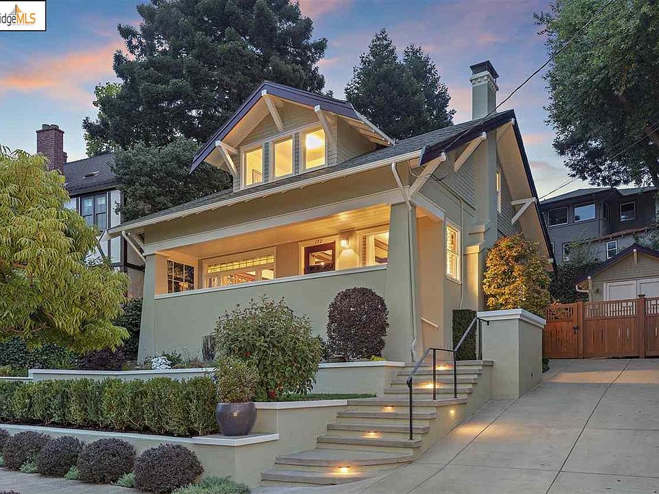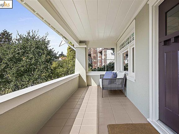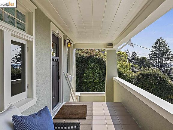 A majestic Bay laurel provides a wonderful backdrop for this warm and elegant circa 1915 Craftsman home. Located in the heart of Kensington, on one of its most desired tree-lined and level streets, it exhibits many of the classic details of the Craftsman style, including a graceful front porch, stained glass window, wainscotting, and a large central dormer. Views of the Golden Gate Bridge and Mt. Tamalpais from the porch, main floor, and top floor sunroom are lovely. Graced with a garden with two level lawn areas and a patio to enjoy outdoor play and entertaining. Spacious formal living room with handsome tiled fireplace, box beam ceiling and wainscotting. Gracious dining room flanked by tapered columns and built-in shelves showcase the stunning tulip leaded glass built-in china cabinets and stained glass window. Beautiful and architecturally harmonious remodeled kitchen with ceramic Heath tiles, laundry area, Wolf range, built-in microwave, plentiful cabinetry & laundry area.