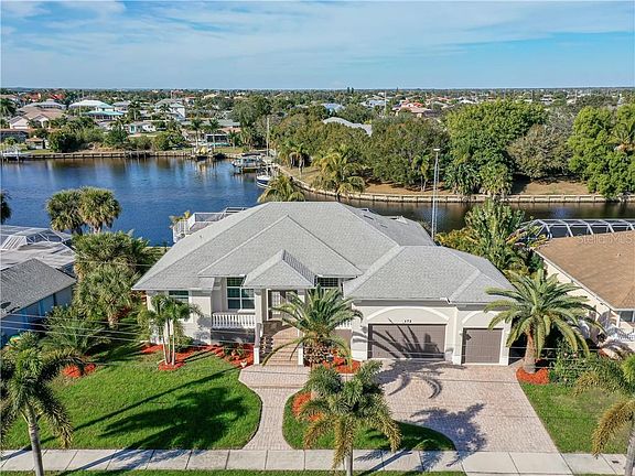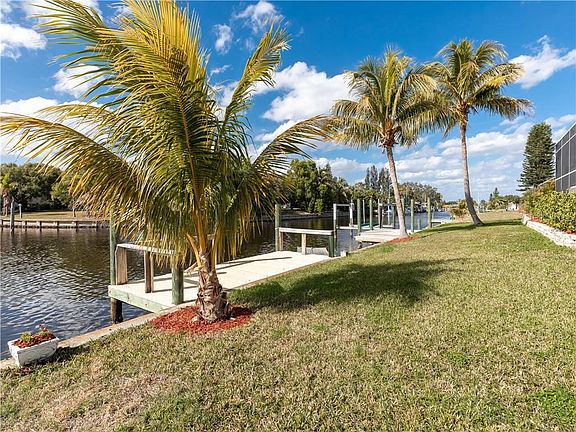 WATERFRONT HOME W/VERY QUICK, SAIL ACCESS & CANAL BASIN VIEW! This move-in ready, 3 bed/2.5 bath + den, waterfront home in the Edgewater section of Port Charlotte has it all - almost instant access to open water, great view of the large canal basin (which also provides for easy maneuverability when docking) & a fantastic location that's close to all area amenities including shopping, restaurants, medical centers & schools. The western rear exposure will delight you nightly w/colorful sunsets. Inside, the home boasts a spacious, open floor plan w/great room, formal dining room & large den. Architectural details include tile flooring throughout the main living area, decorative plant shelves, lighted display nooks, cathedral ceilings & a split bedroom layout. The kitchen features granite counters & wood cabinetry plus a closet pantry, breakfast bar & adjacent breakfast nook. All front-facing windows have arched transom windows above allowing tons of natural light to flow through the home. The large master suite has walk-out access to the lanai & pool, an oversized, walk-in closet & large master bath w/split sinks, a corner tub & walk-in tiled shower. The two guest rooms share a guest bath. One guest room has walk-out access to lanai w/a pool & canal view. Outside, the brick-paver lanai boasts an in-ground pool w/attached spa. A spiral staircase leads to a roof-top deck that is perfect for sunbathing. Deck is spectacular for watching fireworks, too! The backyard features two docks (one w/a 12,000lb boat lift). Electric hook-ups are available at the dock w/the lift. Home has great curb appeal w/meticulously-maintained, tropical landscaping. Other amenities include oversized, three-car garage, insulated interior walls for energy-efficiency & sound-proofing. Make an appointment & fall in love today.