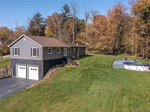Discover picturesque privacy in all seasons! Exceptional one-of-a-kind rustic ranch residence nestled on 2 lush acres serpentined by breathtaking trees and tranquil uninterrupted natural scape. Beautifully designed with airy architectural appeal and handsome craftsmanship. Showcasing dramatic soaring cathedraled ceilings in sprawling open LR/DR underscored by rich wide-plank floors, anchored by grand-scaled hearty stone fp, and illuminated by exaggerated windows with multidirectional south/east/west exposure to invite the outdoors in! Freely adjoining, the granite-clad gourmet kit w/multiple serving/eating islands, ss appl, and customized wood cabinetry boasts equally open fp/nature views. Charming cozy den w/iron scroll-inlaid barn dr, spacious hw-underscored BRs, attentively-renovated light/bright baths, and sensationally-sized finLL w/GR, exerciserm, 4BR, 2fp. Amenities aplenty w/oversized extended height 3+grg, abundant stg for avid sportsminded, picturesque views in all seasons!