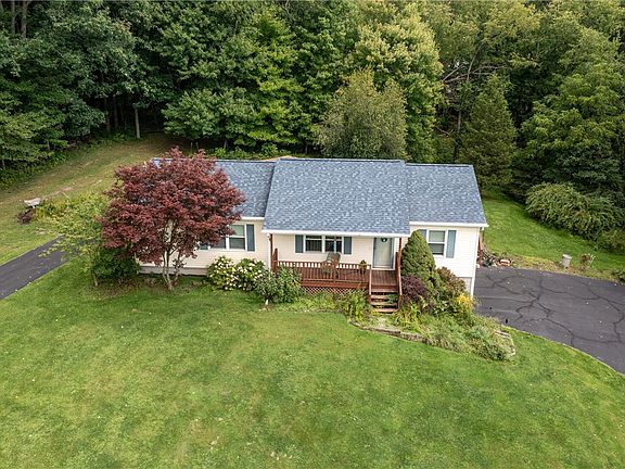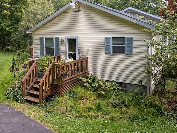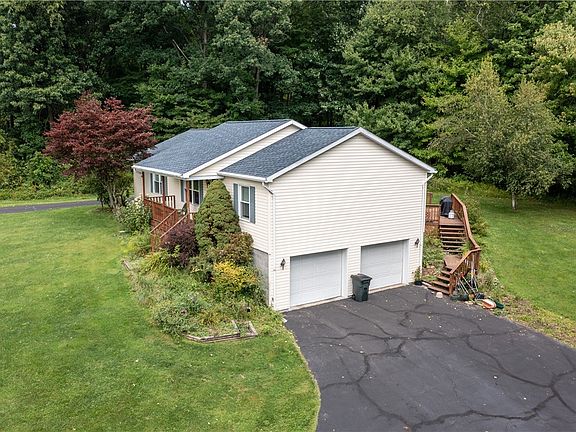 This 3 bedroom 2 bath home is only 25 years young and sits on a large lot with double driveways. This home has loads of upgrades including a newer roof and windows. The spacious eat in kitchen has loads of counter space and a large pantry which was designed to be a main level laundry and could easily be converted, the appliances are included along with the washer and dryer. The dining room has a new patio door which leads to a backyard, great for entertaining. The bedrooms are nicely sized and the primary bedroom has its own full bath. The neighboring 14 private acres behind this home attracts lots of wildlife. A flock of turkeys and deer are daily visitors which you can watch from your large multi-level deck with a charming pergola. The lower level of the deck has extra support for a hot tub. The 12 course walk out basement appears very dry and could be finished. The baseboard heating is zoned for each room including the basement and garage. The home also has central air conditioning.