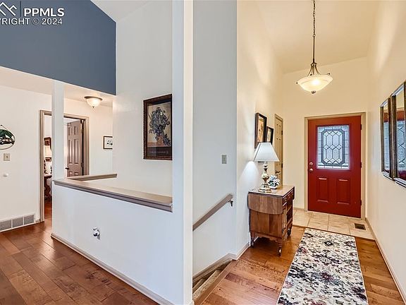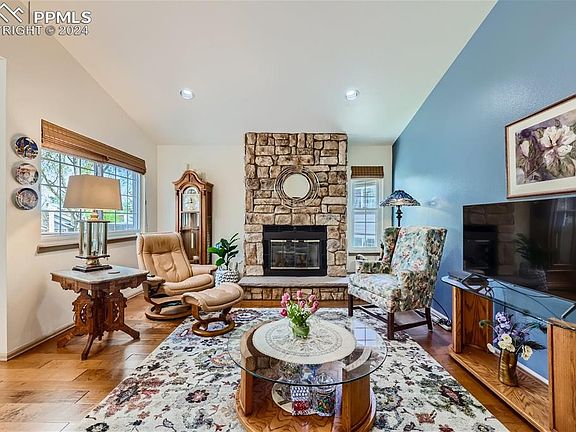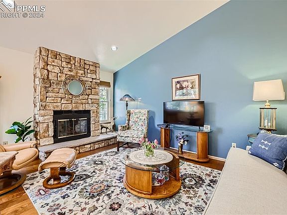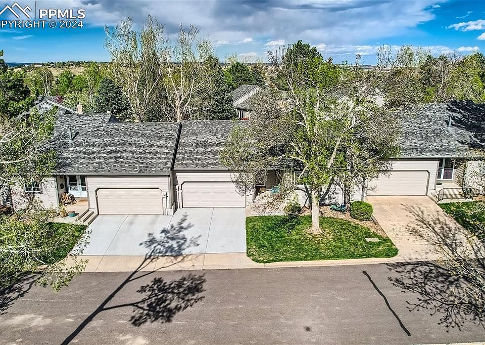 Beautifully remodeled fantastic main level living townhome at the foot of Cheyenne Mountain. You enter through a covered porch with a gorgeous view of the mountains and into the foyer with coat closet and new wood flooring. Onto the living room with a custom floor to ceiling stone fireplace and hearth as well as wood flooring. The dining and kitchen are adjacent to the living room, a great flowing floor plan for gatherings, walk out to the trex deck with stairs to the common area. The kitchen is lovely with granite countertops, newly painted cabinets, stainless appliances. Garage is off the kitchen. Down the hall past the living room into the office and main level laundry area. A full bath is off the office and has been updated with a granite countertop. The primary suite is private and large off the hallway and has a great mountain view. The countertop is also granite in the primary suite and the custom spa/shower adds to the serenity of the primary suite. Down the stairs to the garden level lower space. The family room can accommodate a pool table and is a wonderful entertaining space. Another laundry area is on this lower level. The full bath has been updated with a granite countertop and serves the family room and two bedrooms down the hall. Both bedrooms are ample sized and light and bright. The storage room is a perfect space for all your holiday decorations, equipment, luggage. This home is a true Colorado retreat: within walking distance to the Country Club of Colorado golf course, restaurants, shopping, hiking trails, parks and award winning district 12 schools. Enjoy the community swimming pool in the summer months * New roof in 2021* new furnace in 2019* New AC and water heater in 2019* New interior paint and wood flooring* Kitchen and bath upgrades* New main level laundry area. Close to major arteries, Fort Carson , minutes to downtown, Pikes Peak state college, Cheyenne Mountain state park. Perfection Awaits
