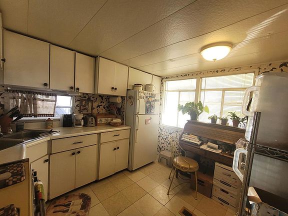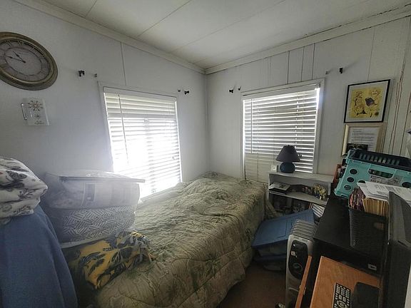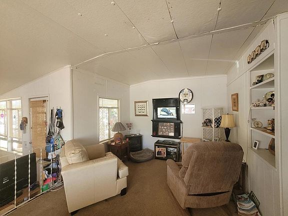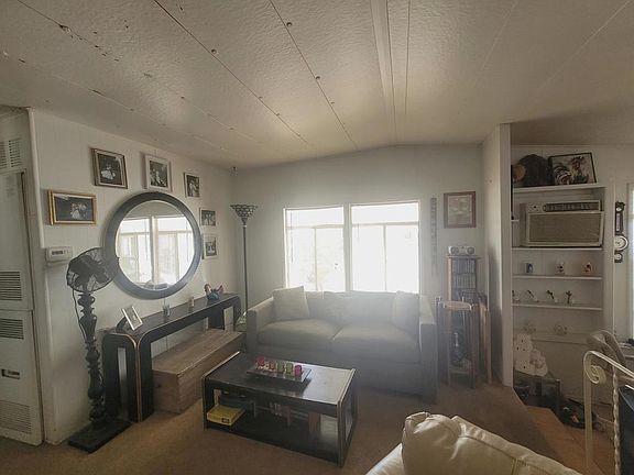 Located at 172 Coyote in the desirable Royal Palms Mobile Home Community, this cozy 1963 GreatLakes single-wide home was built with 540 sq. ft., and there is an additional 140 sq. ft. addition to the home. An outstanding feature of the home is that it is situated on a lovely, tree-shaded lot with a spacious yard that includes a large grassy area perfect for entertaining. The home is ready for a new owner and the updating that can enhance its existing charms. Entry to the residence is through a bright red door which leads into the expanded living room. The kitchen is to the right, at the front of the home. Opposite, beyond the living area is a small guest bedroom. The primary bedroom is at the rear of the home with the full bath, with shower over tub, conveniently situated close to each bedroom. The home has central gas heating. There is a window unit air-conditioner in the living room of the home, and there is also a swamp cooler for use in all but the most humid period of the summer. The home is situated not far from one of the two laundry facilities provided by Royal Palms. There is one storage shed on the property and parking on the west side of the home is covered by a full awning. Monthly space rent at this appealing retreat will be $810 / month.