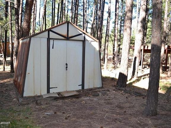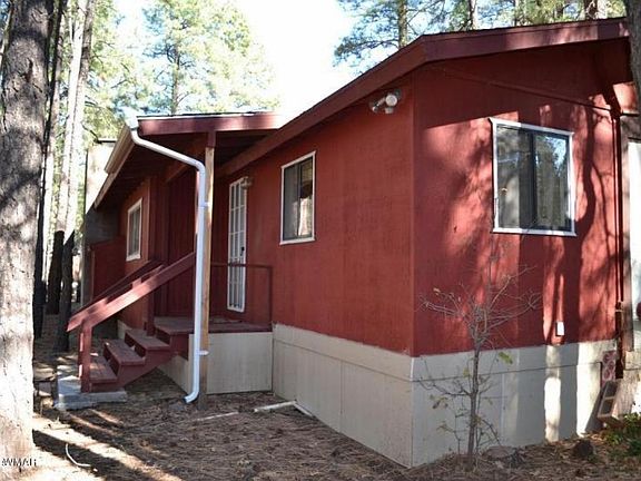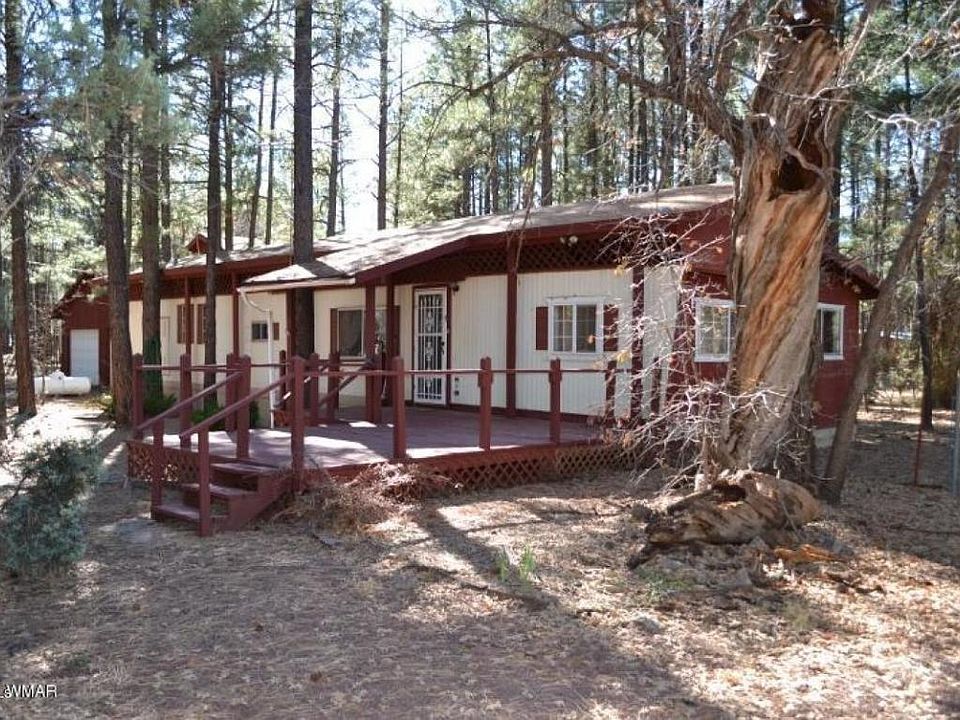 Great deal! Interesting home built from a single wide manufactured home with site built addition. Home has recently been painted and new flooring installed. Large open plan Great Room area with wood burning fireplace, 2 beds, 2 baths plus a den and large laundry room. Awesome 1000+ SqFt 2 Car Garage/work shop with large attic storage area - convert this into living space? Lots of potential here, either for a year round home or summer retreat. Horses ok. Located in the heart of the Forest on 1 acre, but close to all amenities in Lakeside. Due to age of the home, cash only.