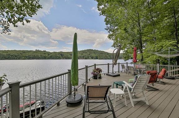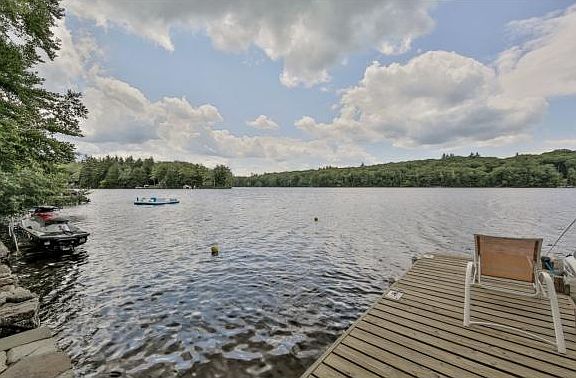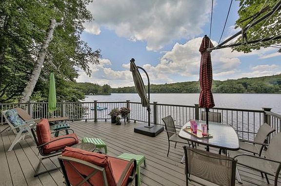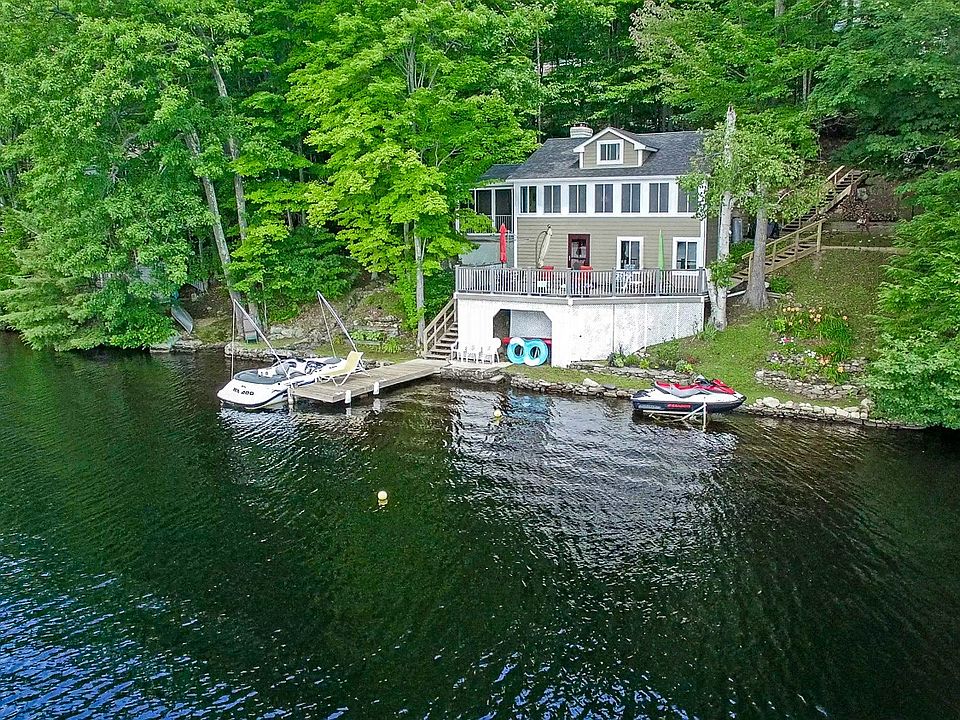 A SUNNY POINT OF VIEW for this premier, year-round waterfront home with expansive WESTERLY VIEWS situated on a DOUBLE LOT (.43acs) and 150 ft of water frontage and wooded privacy on both sides. Just as the present owners have done for 29 years, YOU, YOUR family/friends will love to GO TO THE LAKE house (only 35 minutes from Manchester NH). Enjoy the year-round splendor of the lake with immediate views via a wall of windows from the kitchen, dining room and the living room with fireplace, or lounge on the 35' x 17' deck and private dock areas. The master bedroom overlooks the lake and the screened-in porch. The large LOFT is a great sleepover room space for 4 beds. GREAT CONDITION: New roof and windows, Brazilian Cherry floors, cedar exterior, washer/dryer hookup, FOR MORE SPACE: Add a second story or consider finishing OLD CAMP/boat house/bunkhouse! Septic is 500 galls. A HOME for ALL SEASONS: SWIM, POWER BOATING or ICE FISH... or go skiing at Mt. Sunapee 25 minutes away. See VIDEO Tour...VISit today!