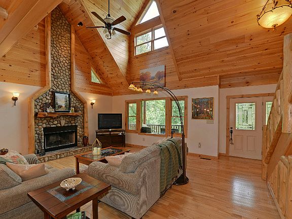 Quality Construction 3/3 Chalet. Log siding, BIG SPACES! Wood Ceilings & Unique Dormers, Exposed Beams. Quartz/granite countertops in kitchen. Large Dining area,Hardwood floors. High Cathedral ceiling in Great Room. Wood-burning Fplc with Log Mantle. Lots of natural light. Laundry on main. 2 Guest rooms on main. Master suite has Private Balcony,Bath has jetted tub and sep shower, double vanities. Full finished Basement has Game Den! 2 water heaters. Great Garden areas and year-round views of creek and mountains.Large entertaining porches and decks. Recently restained. Lovely and Spacious Mountain Home. Very Private setting.
