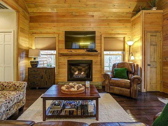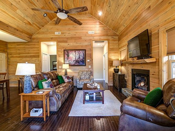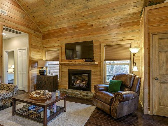 You'll fall in love with this PRIVATE, SINGLE LEVEL, and FULLY FURNISHED turn-key home located in the gated Valley River Vista community! Front door entry with side glass panels invites you to step into your Great Room with T&G vaulted ceiling, unique dark wood floors and a beautiful fireplace to warm the chilly mountain evenings. Popular open floor plan that's great for gatherings. Your kitchen has SS, lots of cream color cabinetry that contrast to the dark wood floor. Down the hall is your laundry area, guest bed, bath and Your Master Ensuite. Both bathrooms have decorative tile showers. A fire pit area and large deck off your front porch makes great for entertaining or enjoying nature!