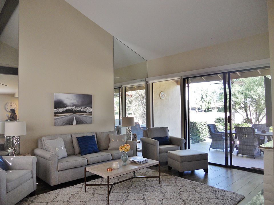 Experience breathtaking golf and lake views from the patio of this beautifully remodeled 2-bedroom plus den that owner has added a bed to, 2-bath condo. This stunning home features a cozy fireplace, soaring vaulted ceilings, and porcelain tile that mimics wood grain for a modern touch. Enjoy recessed lighting, ceiling fans, a convenient laundry room, and direct access to the attached garage. The open kitchen is a chef's dream, showcasing granite slab countertops, stainless steel appliances, custom cabinetry, and an elegant backsplash. As an end unit, it benefits from extra windows that flood the space with natural light. Outdoor living is at its finest on the charming patio, perfect for relaxation and entertaining. Centrally located in Palm Desert, Monterey Country Club offers the ideal blend of comfort and convenience. Don't miss out on this incredible opportunity! SEASONAL RENTAL ONLY. AVAILABLE JANUARY & FEBRUARY ONLY.