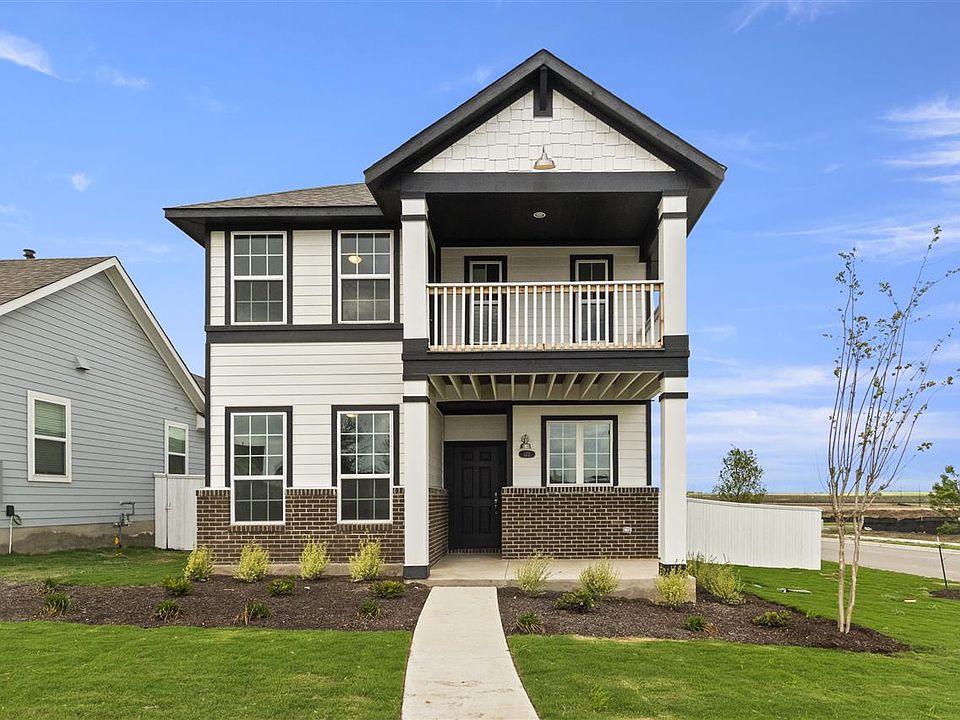 MLS# 4377931 - Built by Brohn Homes - Ready Now! ~ CORNER LOT two story brick accent home in Harvest Ridge subdivision. Primary bed downstairs with 3 bedroom upstairs. Kitchen features island, 42 inch brown cabinets, quartz countertops, and upgraded stainless steel appliances. Other features include an extended rear covered patio, 2 car detached garage, upgraded tile in main living areas, and front balcony!