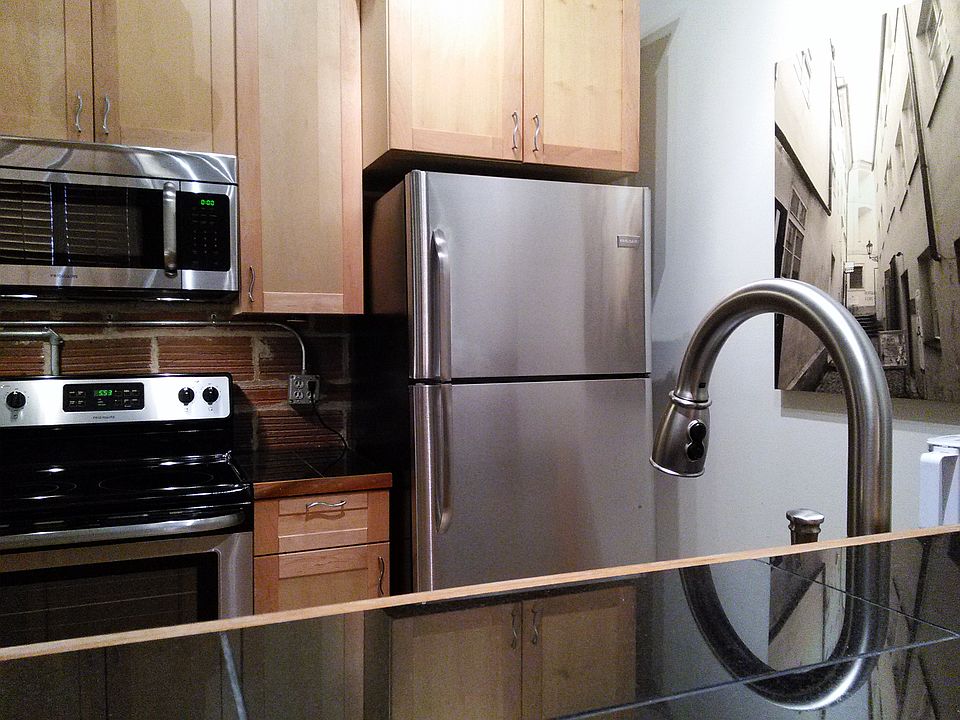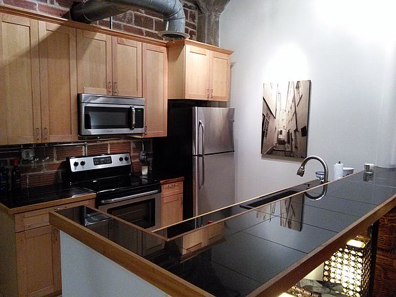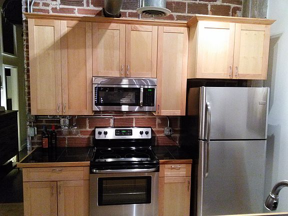 Open Loft with Exposed Brick and new Kitchen Cabinets. Former Industrial Elevator can serve as bedroom or office. Updated Bath with storage above.