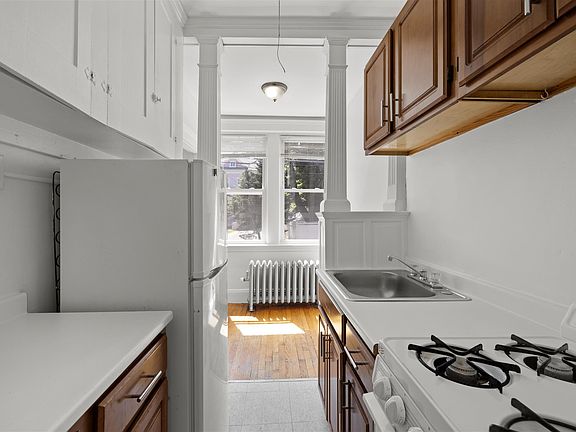 Large studio on raised 1st floor of building. Separate galley kitchen with space for small dining table. Also a bit of extra space big enough for small desk / dresser. Kitchen has good storage space and counter space. Gas stove. App based laundry room onsite, no more quarters! Overall GREAT studio for the price. Short walk to Malden Center T stop. (Reference #179907)