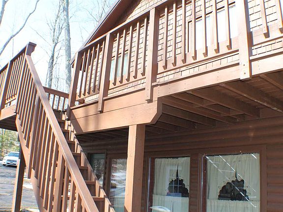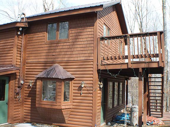Privacy with a lake view! Yr round log sided home on Peck Lake with easy lake access and a view of Sunrise Bay! Open concept, vaulted ceiling, beautiful stone fireplace, wood floors, kitchen with pantry storage, two BR's on second floor, office on the first floor could be a BR, master with walkout to private deck overlooking the lake, & a large loft area with storage. Almost 2 acres of land makes this home very private. Covered patio, deck, 1 car gar, two parcels 100.11-1-16 and 100.11-1-15 included.