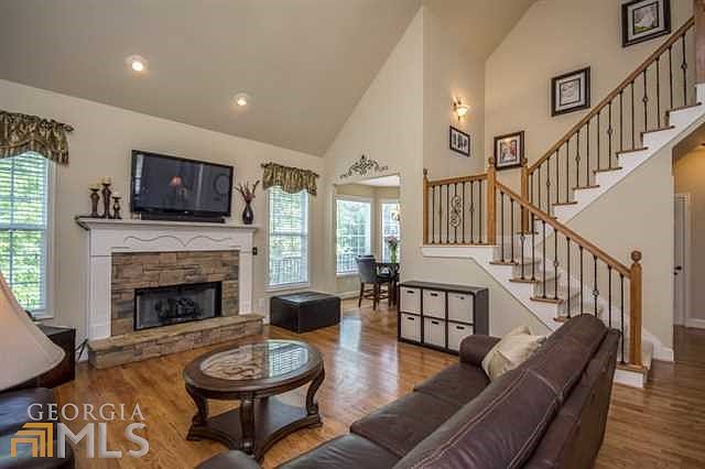 Beautiful Craftsman home in the sought after subdivision Mountain View. Well maintained subdivision with all the amenities plus the breathtaking views. Home situated with level driveway which backs up to woods and privacy! Gleaming hardwoods on main with a grand entry two story foyer. Vaulted ceilings in family room that open up to gorgeous wrought iron spindle staircase to your 2nd level. Spacious master on main, tiled master bathroom w/upgraded cabinets & huge walk in closet with built in cabinet system. Top of line cherry stained kitchen cabinets & corian!