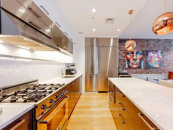 Spectacularly designed 2 bed/2 bath home situated in a boutique 14 unit loft condo conversion of an old manufacturing building. The apartment boasts wide oak floors throughout, exposed brick and beautiful wood beams that provide great character and texture. The open plan kitchen has European cabinetry with Calacatta Gold marble countertops and backsplash, and high end Miele and Bertazzoni appliances. The Master bedroom has a walk-in closet and an en-suite luxurious bathroom with custom reclaimed wood panels, dual sinks, Calacatta marble heated floors and a large European shower. The second bedroom also benefits from a walk-in closet, and there is a second full bathroom with a tub. In home W/D for your convenience and central air. Amenities include keyless entry with video intercom, a large fitness center, bike storage, regular storage and a part-time superintendent. Centrally located in the heart of Williamsburg, the building is moments away from McCarren Park, the Williamsburg waterfront, the G and L trains and the East River Ferry.