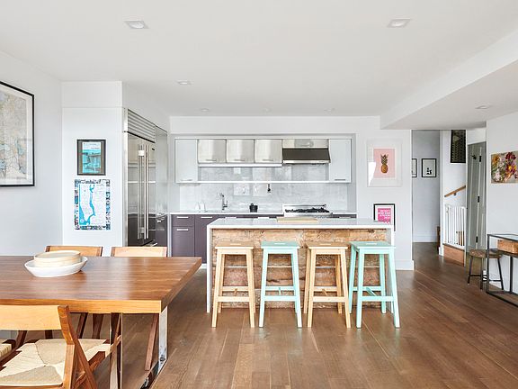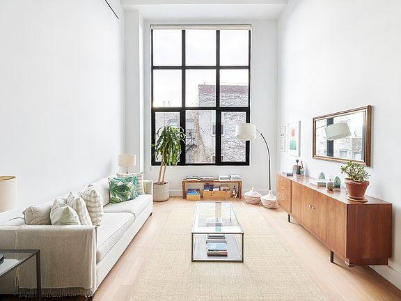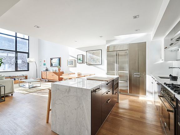 Residence 3B at highly sought after 172 North 10th Street - an exclusive Northside Williamsburg condominium comprised of just 14 discreet homes - is a mint condition three bedroom, three bathroom duplex set within an architectural masterpiece. Converted in 2014 by the award-winning architecture & design team at the Meshberg Group, the property's industrial history is beautifully blended with every imaginable modern convenience. The end result is a seamless combination of aesthetic perfection and real world practicality. After passing through the home's generous foyer and entering into the grand, open living space, you'll find staggering 16 foot ceilings bathed in natural light from the massive south-facing wall of windows. There are dedicated spaces for both living and dining, while the enormous open kitchen bookends the room. Highlighted by Calacatta Gold Marble countertops and backsplash, appliances by Bertazonni and Miele, the true chef's kitchen's wide marble island, accented with reclaimed wood, offers additional seating four 4. Down the hall lies the spectacular master suite. A pure urban oasis, this huge, sunlit space offers two walk-in closets, a gorgeous en suite bathroom with reclaimed wood ceilings, a luxurious spa shower and dual sink vanity with marble counters and wood accents. Just beside it lies the large second bedroom with its own custom closet, high ceilings along with additional south-facing oversized windows. The home's second bathroom, replete with one of two deep soaking tubs, a washer/dryer and additional closet, sits at the front of the residence for easy guest access. Head upstairs to the third bedroom, third full bathroom with yet another deep soaking tub and yes, the third walk-in-closet. In addition, the current owners have created a two-person office along with a custom storage area for this incredibly rare space. Solid white oak wide plank hardwood floors run throughout the nearly 1650 square foot home, storage space abounds and efficient central heating and cooling are in place. The special elevator building features video intercom, a large gym and an attentive super. This is a rare opportunity to secure a piece of Northside Williamsburg history in mint condition with no trade offs to speak of.