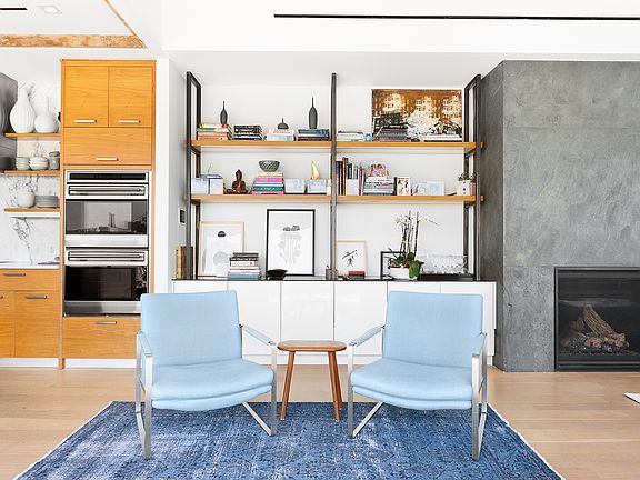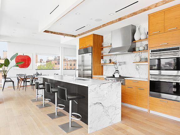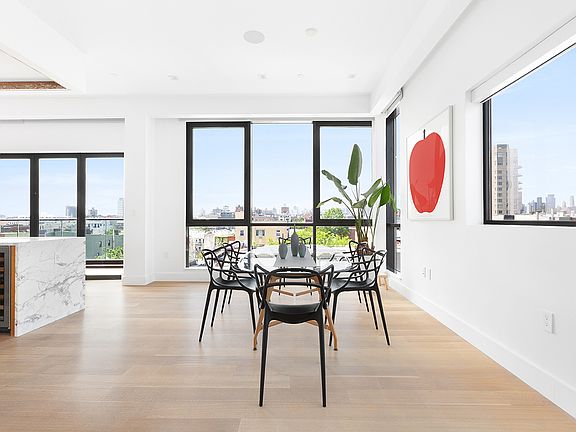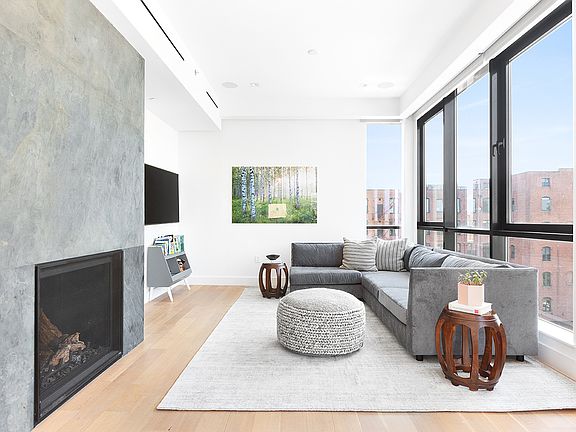 Virtual and video tour available. Designer's private residence! This custom designed penthouse is home to one of NYC's top interior designers and has been crafted for stylish and comfortable living. 172 North 10th street is a discreet loft condominium conversion with only 14 homes. Penthouse 5 sits at the very top of the building's two story glass addition and encompasses the entire top floor as well as the entire south facing roof (both via keyed elevator). No expense was spared or convenience overlooked in the design of this home. There is a full RTI smart home system which controls lighting, automatic shades, temperature, and AV system Sonos sound system. All lighting and shades are Lutron homeworks, with full dimmers and heating and cooling is central with 2 zones. The massive entertaining area faces south and has a foldable glass wall which fully opens to the terrace and has sweeping views of the Williamsburg Bridge and Manhattan Skyline. There is dining space to comfortably sit up to 12+ guests, a large windowed home office area, as well as a large double sitting area with an oversized Marquis gas fireplace with black slate hearth. The open kitchen is ideal for any home chef (or professional!) with a Sub Zero refrigerator, separate pantry closet, integrated Miele ultra-quiet dishwasher, two wolf wall ovens and a 6 burner Wolf vented cooktop with pot filler. Calacatta Gold Marble countertops and island with waterfall edges and warm custom walnut cabinetry make this an inviting space to cook and entertain. The island comfortably sits up to 6 guests. Moving into the private quarters, all 3 bedrooms are located on the opposite side from the entertaining space with entrances off the hall. The master bedroom is also separated from the 2nd and 3rd bedrooms for maximum privacy. AV, laundry (large capacity LG vented dryer system) and 3 enormous storage closets can also be found off the entrance hall. Each bathroom is generously sized and luxurious in it's own right, but the master bath is truly a spa-like haven with floor to ceiling windows, an oversized multi-zone shower, separate deep soaking tub, double vanity and adjacent dual walk in closets. The private roof terrace is just as luxurious as the apartment interiors and fully outfitted with lush landscaping, a full automatic irrigation system, a custom retractable solar shade, direct-line gas grill and multiple seating and dining areas for you to relax and take in the breathtaking views. This spectacular refuge is your own private suburb- with copious amounts of outdoor space, total privacy, 360 degree protected views and not one but TWO private parking spots in the building (by separate purchase). Located in the heart of Northside Williamsburg- one block to McCarren Park, 3 blocks to the waterfront (and ferry), and around the corner from every convenience including Whole Foods, Blue Bottle Coffee, the Apple Store. as well as some of the best restaurants and shopping in all of NYC.