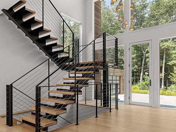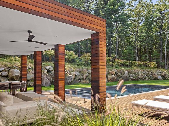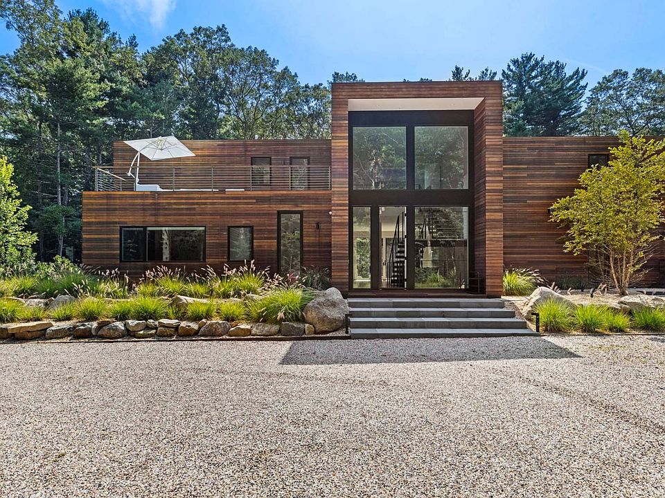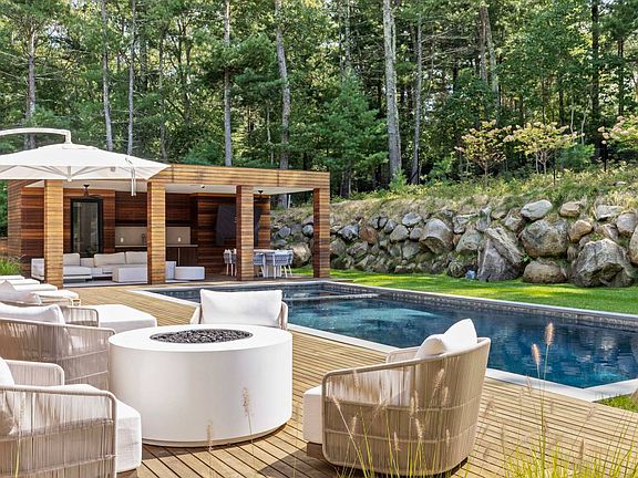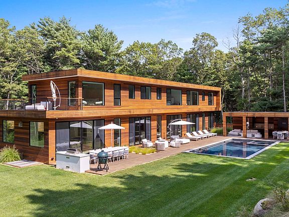 sq ft modern residence is privately situated on nearly 3 acres of quiet and seclusion. The entry is highlighted by a custom steel staircase. The immediate connection between the living space and the ourdoors, welcomes you into the home and is highlighted by the southern orientation. The living room connects to the generous kitchen continuing to a sun room with gas fireplace. The minl level is completed with a junior primary suite and a second en suite bedrrom. Outdoors there is lounging spaces, outdoor kitchen & dining overlooking the saltwater pool and spa. The pool house has an outdoor shower, half bathroom and shaded spaces for lounging. The second floor showcases the primary suite - with a large private terrace and a spa-like bathroom. In addition there are three large en-suite bedrooms. The lower level has three additional bedroom suites as well as a large media room and full gym. A short jaunt to both villages of East Hampton or Sag Harbor, allowing access to the world-class beaches and amenities.
