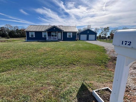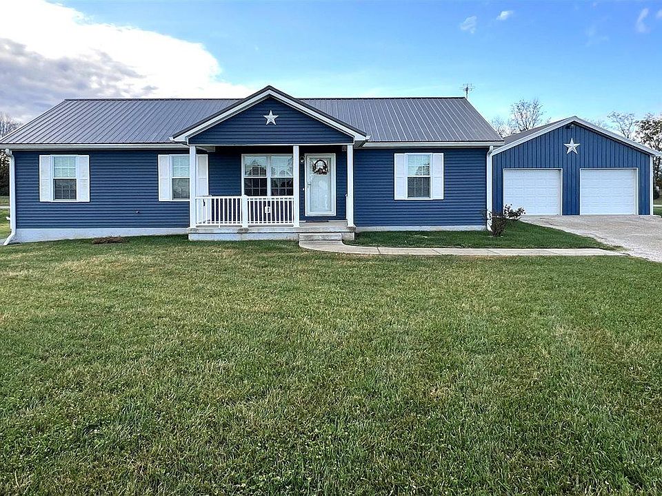 Compare this like new home to new construction and be amazed at the extra value found here. Custom built 3 bedroom 2.5 bath home has many upgrades not typically found in new construction costing tens of thousands more: pantry cabinet, kitchen island, soft touch light switches, upgraded outlets, double hung windows and upgraded exterior vinyl siding to name a few. Besides the abundant interior living space the floor plan features 2 ensuites! Interior features include a living room, kitchen with stove, refrigerator, dishwasher, microwave and work island too! Enjoy your dining area, 3 bedrooms, 2.5 baths, family room, and laundry room with sink. Comfort provided by central heat and air. Utilities include county water, septic system and KU Electric. Other extras include: multiple ceiling fans, solid wood interior doors, walk-in closets, walk-in tub in each bath(one is jetted) 10' x 12' covered side patio with ramped entrance between family room and the garage, luxury vinyl plank flooring throughout, 8' x16' covered front porch, metal roof with 6” gutters, fenced rear yard, 14' x 28' partial basement with electric. The detached metal garage/workshop measures 28' x 30' has 2 oversized automatic opener garage doors plus rear utility door. It also has electricity and concrete floor. Excellent location being close to I-65 Interstate and BlueOvalSK plant. This home features a 1 year Home Buyer warranty for your peace of mind and is in move-in condition. Seller is a licensed real estate agent