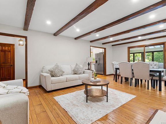 This beautifully updated 4-bedroom, 2.5-bath home sits on more than 2 private acres and has been completely renovated from top to bottom. Every detail has been thoughtfully designed to combine modern comfort with timeless style. Inside, the brand-new kitchen features sleek cabinetry, quartz countertops, stainless steel appliances, and a subway tile backsplash - the perfect space for everyday living and entertaining. The spacious living areas include a sun-filled family room with skylights and walls of windows, a cozy living room with exposed beams and a brick fireplace, and a formal dining area. In this home you will find four bedrooms, including a serene primary suite with its own full ensuite bathroom on the main level. All bathrooms have been fully renovated with modern finishes. The lower level offers a huge finished basement, providing endless options for a playroom, media space, or home gym. Outside, enjoy multiple decks and patios that extend your living space into the private, wooded lot. Practical updates bring peace of mind, including a brand-new septic system, new water filtration system, new heating/cooling, and all-new finishes throughout. The oversized 2-car attached garage provides plenty of storage and convenience. Located on over 2 acres, this home offers both privacy and convenience - a move-in ready retreat that truly has it all.