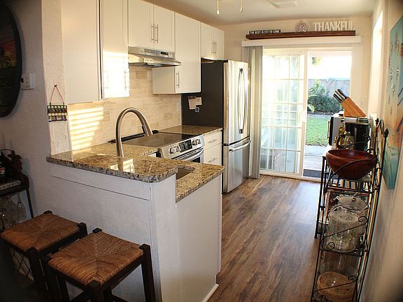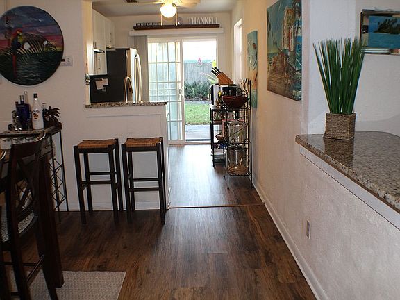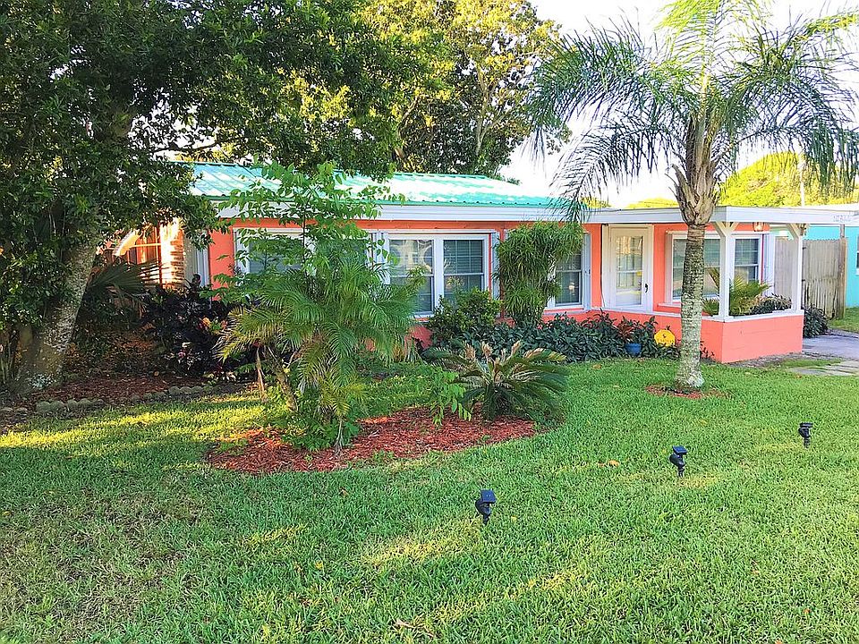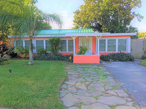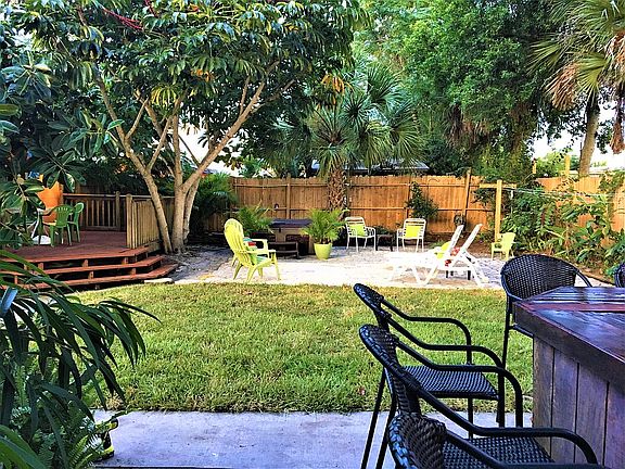 Your Own Tropical Retreat! Great location, close to Al Weeks Beach Park on one end of the street (2 minute bicycle ride!) and a public fishing dock park a few steps away! 3 Bedrooms and home has been renovated with new kitchen, bathroom, flooring, and with private completely fenced in tropical backyard complete with its own tiki bar, hot tub, and outdoor shower with hot and cold water! Kitchen features granite countertops, stainless appliances, travertine tile backsplash wall. Bathroom features updated tile in shower and fixtures, tile floor. Luxury vinyl plank floors in kitchen and dining room, tile and terrazzo floors in the other rooms. Ceiling fans throughout much of the house. Most furnishings and household items convey, ready to continue seasonal rentals if desired - good rental history with repeat seasonal renters who want to come back! New commercial grade metal roof and hurricane accordion shutters for every window and door opening just installed (2021).